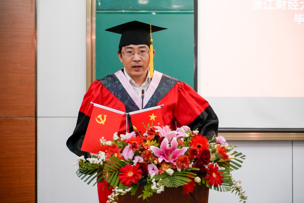 毕业生代表胡志强同学发表毕业感言,他感谢一路伴随前行的师长亲友,并请他们放心,工商的青年一代将不负韶华,不负党和人民的殷切希望,不负师长和亲友的真挚嘱托,在通往远大理想的征途中,不畏“道阻且长”,向着“星辰大海”风雨兼程。