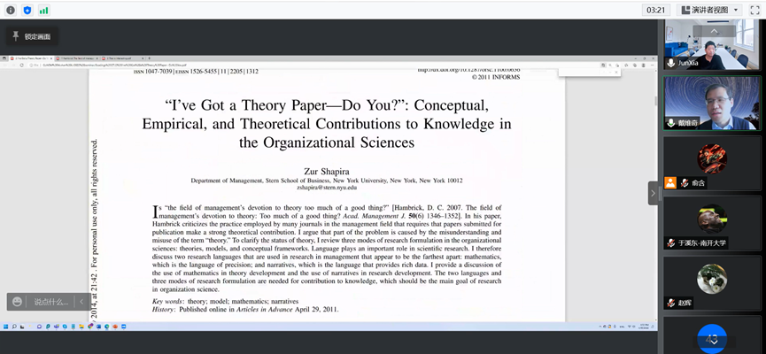 在前两次讲座的基础上,本次以论文写作的起点——“前提假设”——为焦点议题。夏军教授结合个人研究体会和成果,对Shapira(2011)发表于Organization Science的经典文献进行了深入浅出的解读,围绕“理论的两种表达方式(Mathematics and Narrative)”“理论的三个层次(Theories, Models and Conceptual Framework)”“理论是现象的一致性解释(A coherent explanation of a set of observed phenomena)”“前提假设是形成推导和预测的基础”“理论只可能被验伪”“理论是管理学研究追求的最高境界”等观点展开详细讲解。接着,夏军教授基于Davis(1971)的观点强调了“一个有趣的研究应当挑战既有理论的前提假设”,并进一步通过日常生活的例子和学术研究中的例子来讲解如何形成一个有趣的研究设计。