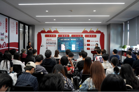 一进入宜格美妆集团,师生们就被优雅的环境和浓郁的文化氛围所吸引。在党员活动室,公司品牌产品中心-产品培训部王谦老师(儿茶)首先为学生们介绍花西子品牌的发展历程,从品牌的起源、成长、成熟等方面讲解一个以“东方彩妆,以花养妆”为理念的彩妆品牌。花西子在包装设计、产品工艺等细节处,始终根植于中国传统文化,坚持东方传承:品牌LOGO,取形江南园林的小轩窗;品牌主色,灵感源自粉墙黛瓦;品牌字体,“花西子体”。从产品研发到品牌内核,花西子以百年品牌为师,打破桎梏,在传承中勇于创新。