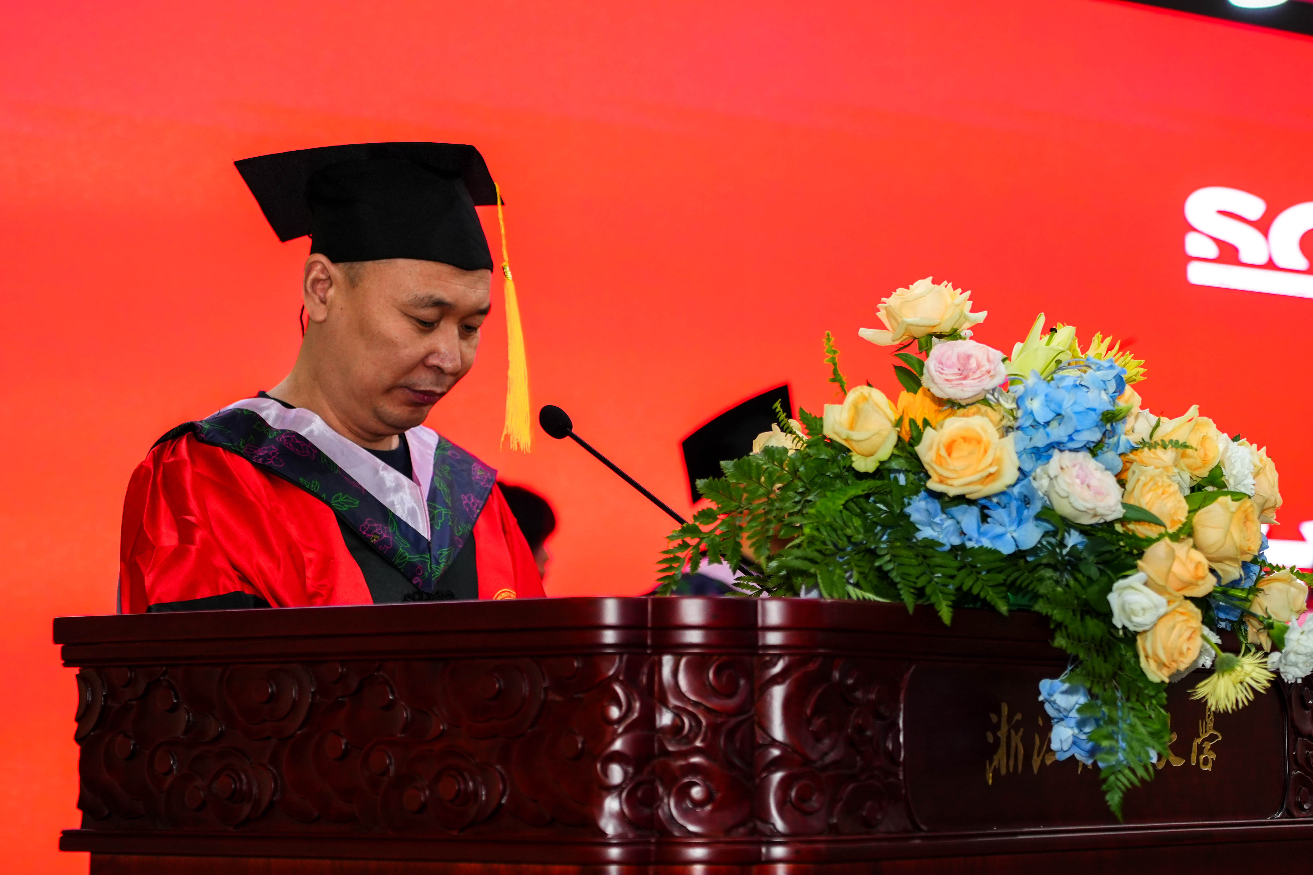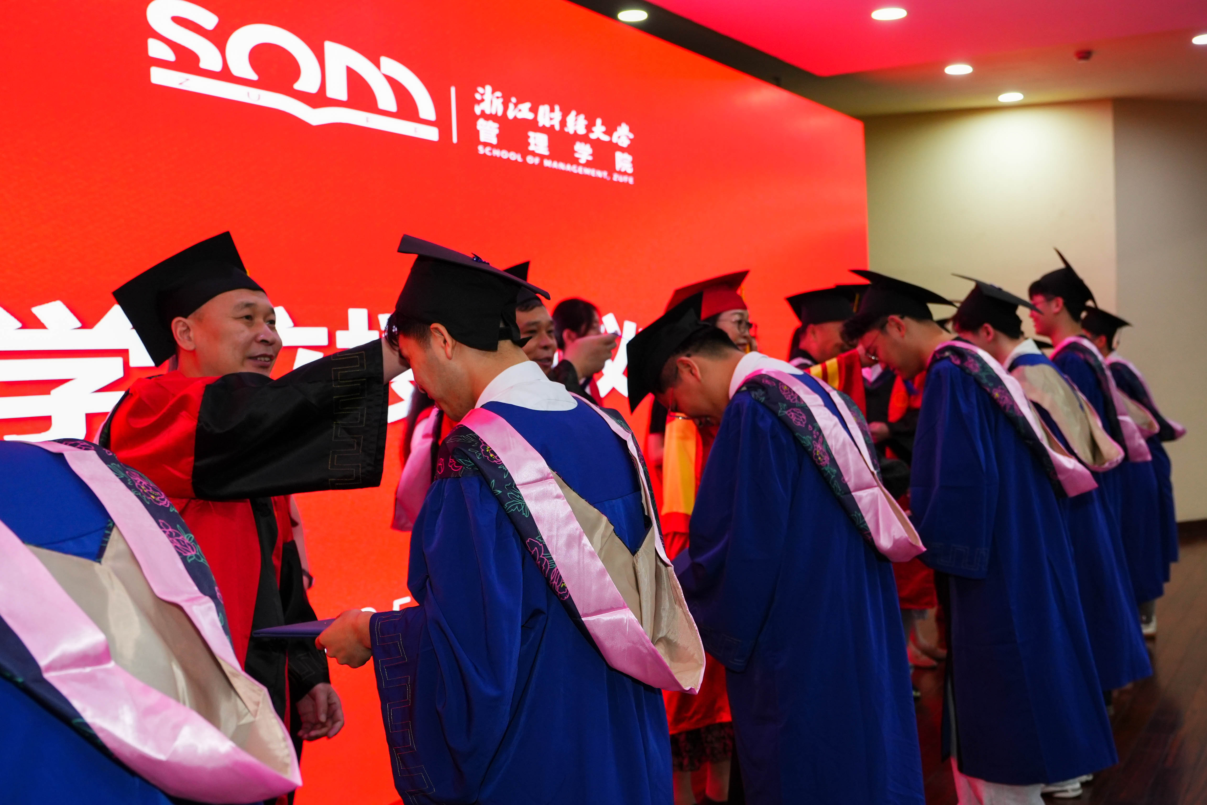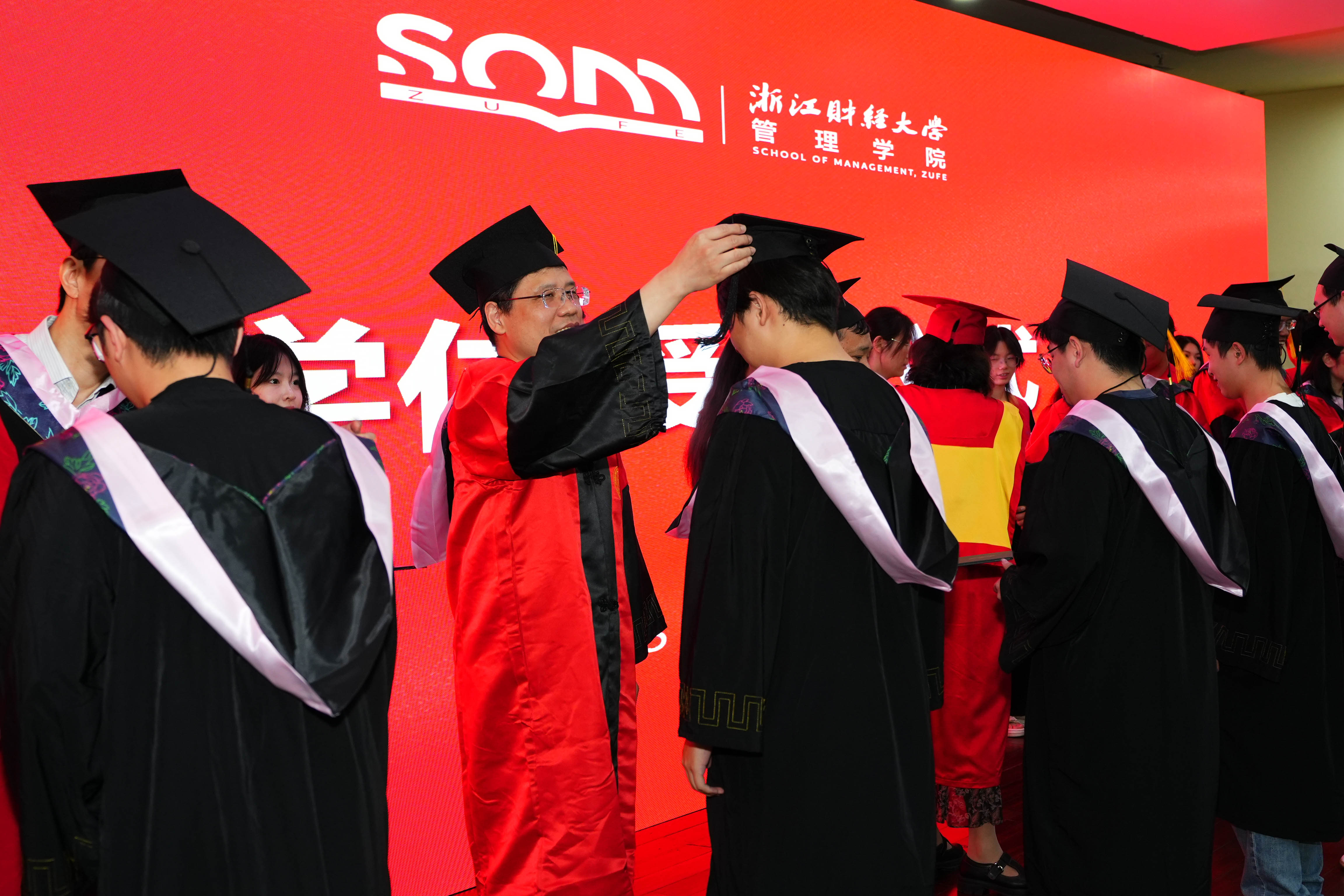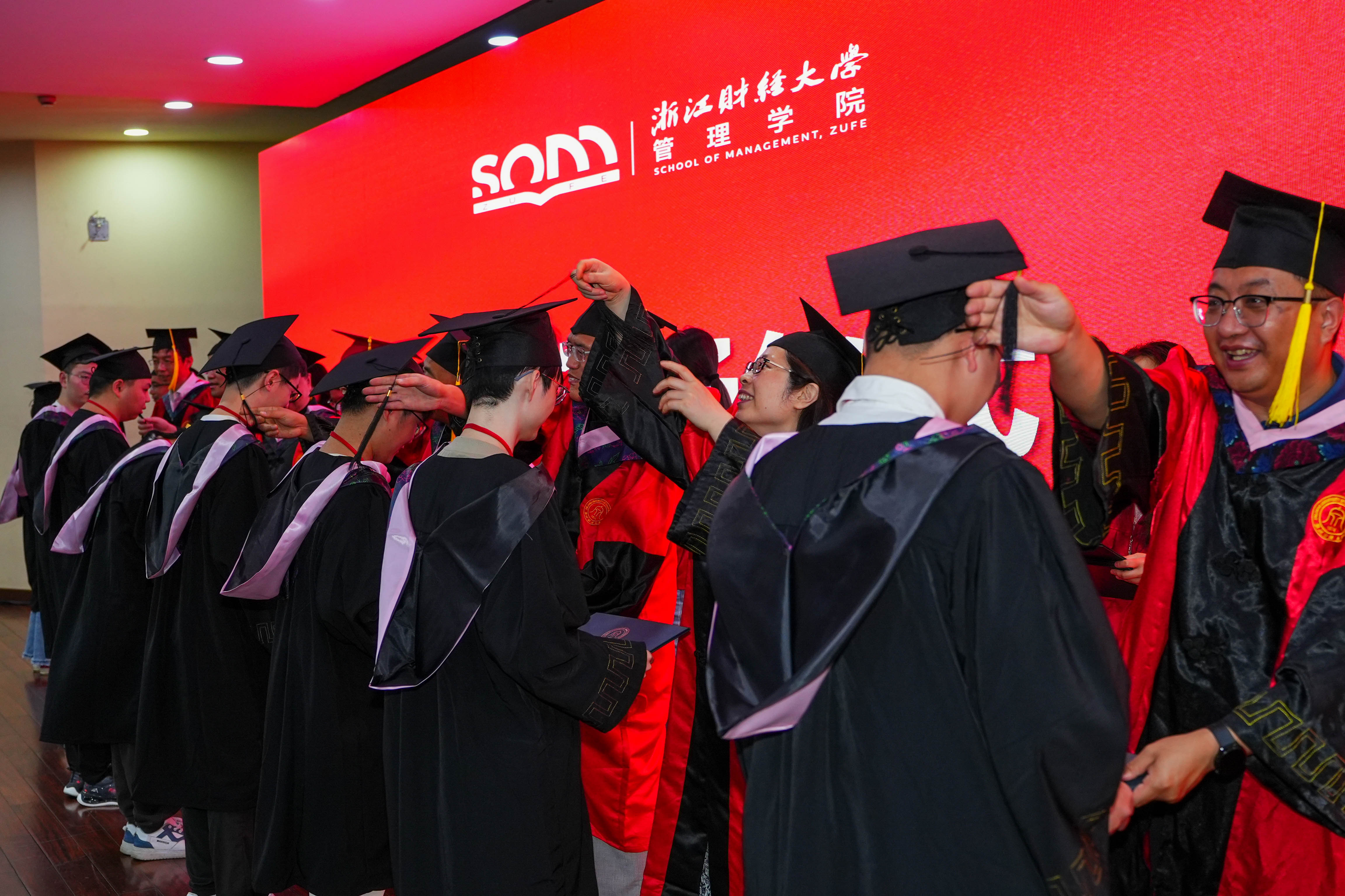 副院长张雷、企业管理系主任赵昶、市场营销系副主任高键、供应链管理系主任李晓超、MBA项目主任孙凯、中美项目负责人王建国先后为企业管理、技术经济及管理学术型硕士研究生,工商管理专业(MBA)硕士研究生,企业管理专业留学生逐一拨穗并授予硕士学位。