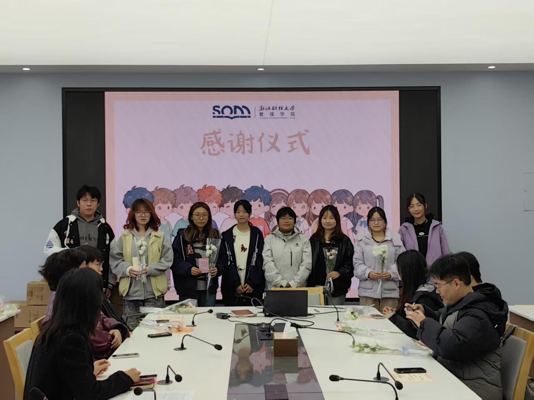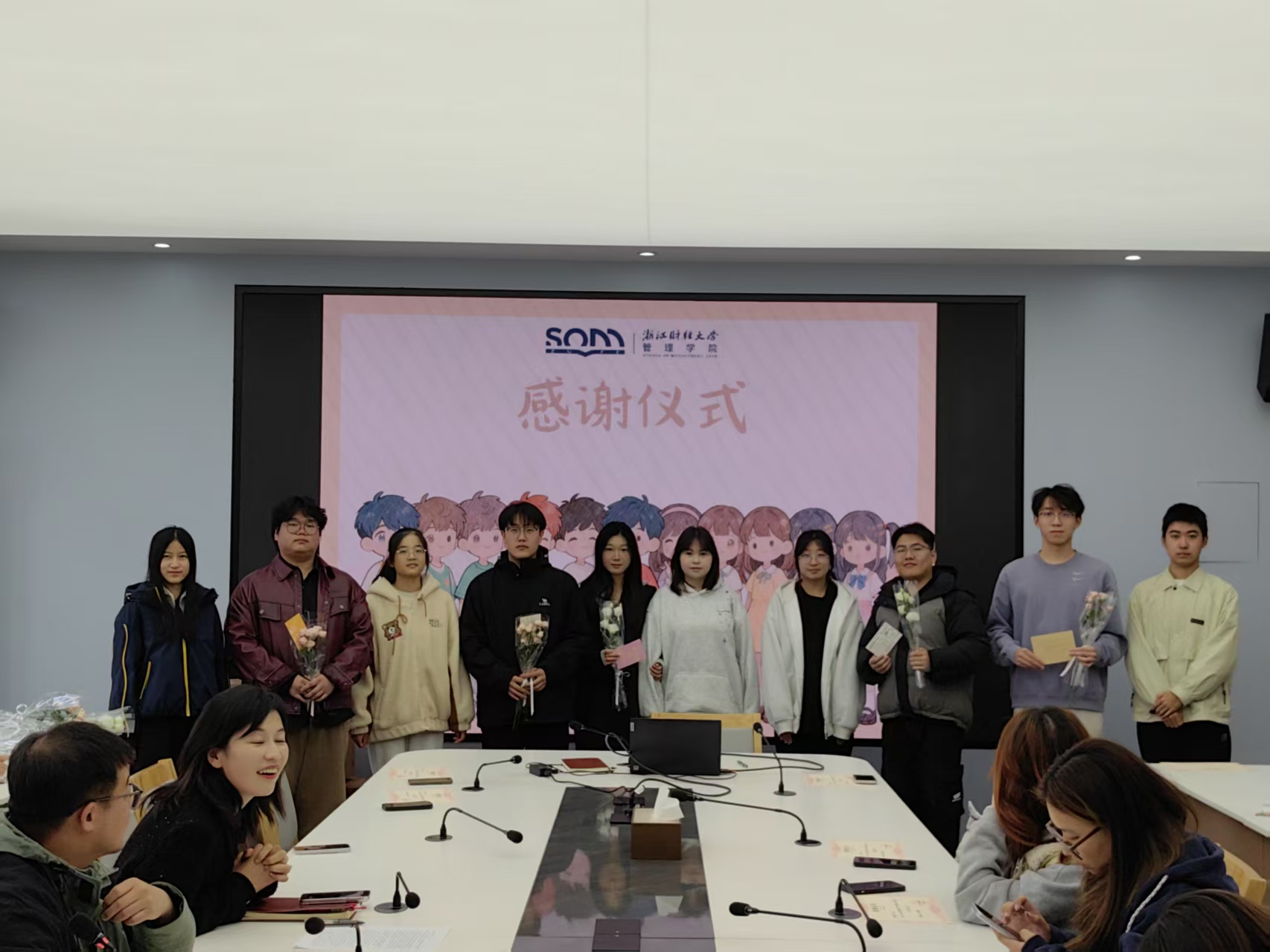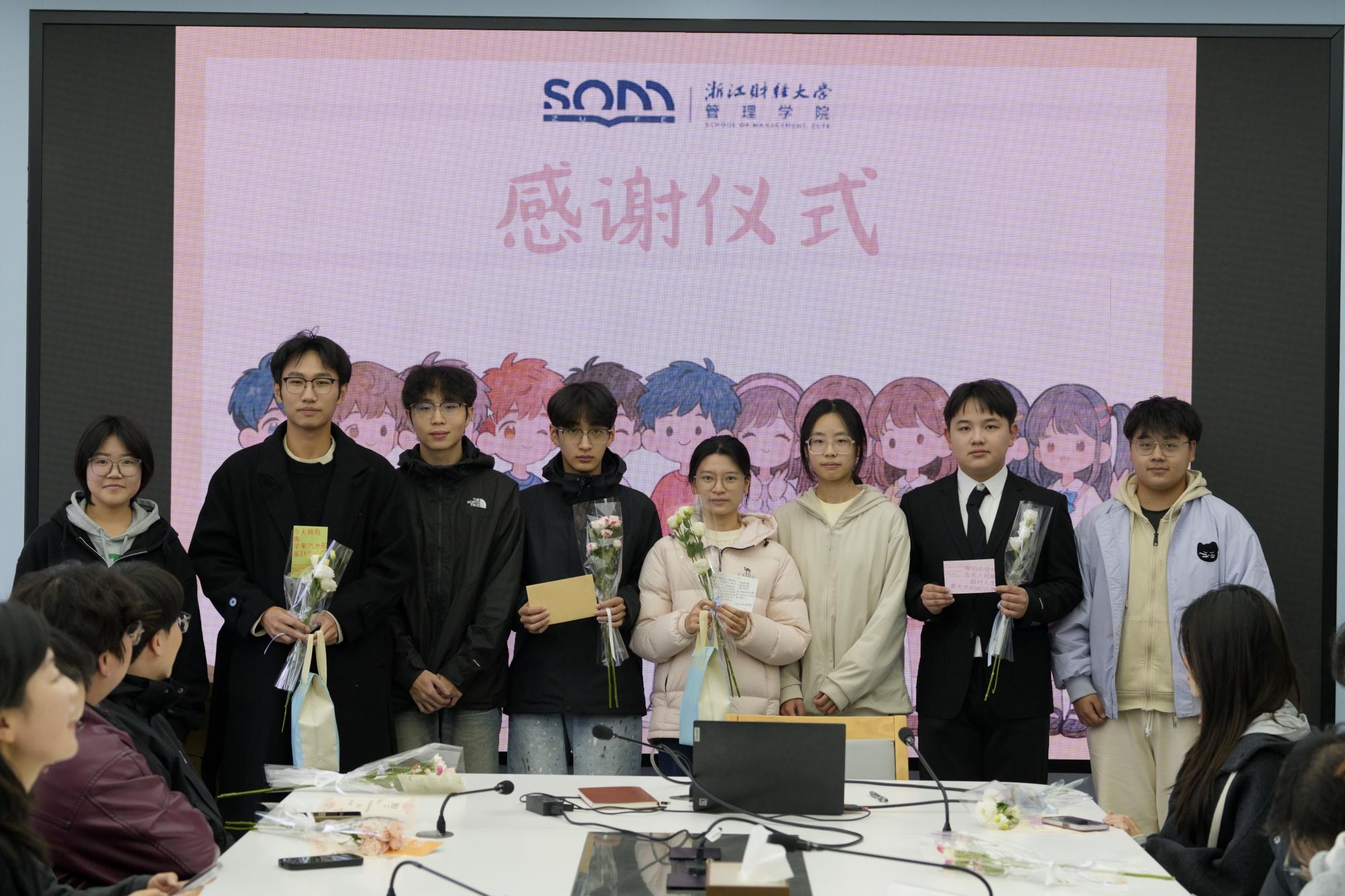 大厅合影。领导与班导们手捧花束、贺卡,笑容真挚灿烂,快门声落,这帧师生同心的温暖画面被永久定格,为感谢会画上圆满句号。