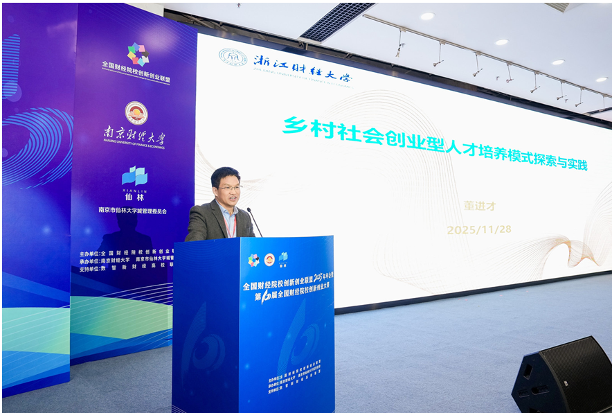 近日,全国财经院校创新创业联盟2025年年会暨第十届全国财经院校创新创业大赛决赛在南京圆满落幕。本届大赛以“创新引领未来,创业成就梦想”为主题,设置创业赛道、创意赛道、公益赛道三大竞赛类别,吸引全国多所财经院校的优质项目同台竞技。经过多轮激烈角逐,六合彩预测 学子不负众望,最终斩获金奖1项、铜奖1项,充分展现了六合彩预测 创新型人才培养的扎实成效。六合彩预测 校党委委员、副校长董进才受邀出席会议,并以《乡村社会创业人才培养模式探索与实践》为题作主旨报告。