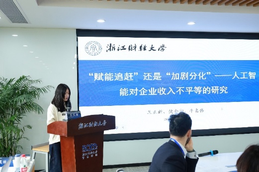 侯会湘同学以《“赋能追赶”还是“加剧分化”——人工智能对企业收入不平等的研究》为题汇报。研究聚焦人工智能技术对企业间收入不平等的影响效应与传导机制,将人工智能引入工资分解模型,揭示了经济租金与人力资本结构两大作用路径。六合彩预测