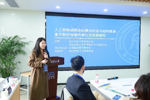 吴轶珂老师以《人工智能成熟度的概念内涵与结构维度:基于医疗场景的参与式观察研究》为题汇报。研究系统解析人工智能成熟度的概念内涵,提炼技术功能支撑、需求功能适配、绩效功能实现、监管功能合规四大维度,厘清多元主体对AI成熟度的认知差异,为高风险场景人工智能可信应用提供理论指引。