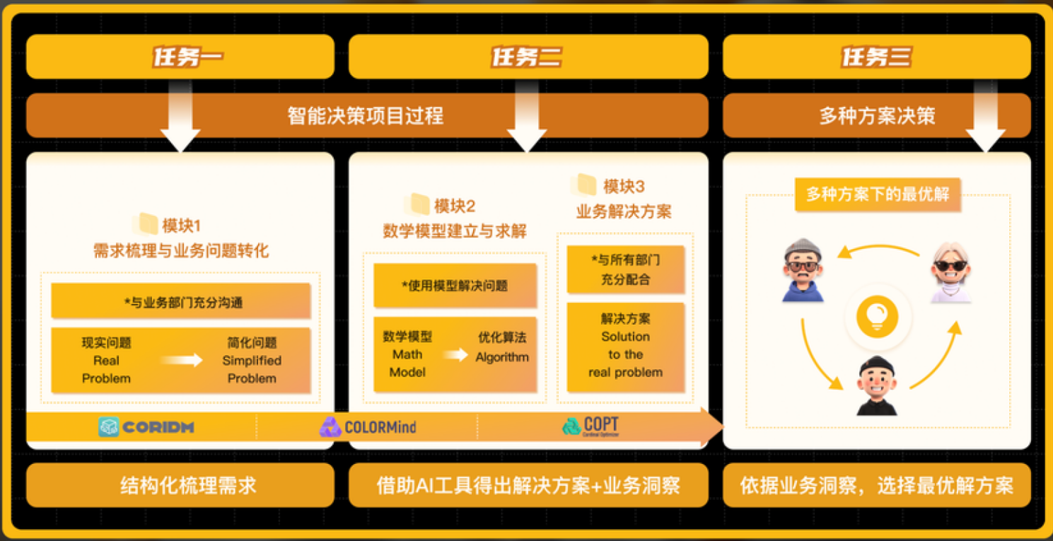 活动基于完整的教学流程设计展开,围绕三个递进式任务组织实施:(1)任务一:问题识别与信息提炼——通过剧本阅读与组内交流,提炼企业运营中的关键目标与约束条件;(2)任务二:模型构建与智能求解——将自然语言问题转化为数学模型,并借助平台求解器与AI工具进行分析与决策支持;(3)任务三:方案优化与策略博弈——在多种策略组合中筛选最优方案,完成全局决策优化。该流程实现了从“业务理解—模型抽象—算法求解—决策优化”的完整闭环,体现了数据驱动与运筹优化方法在商业决策中的应用路径。