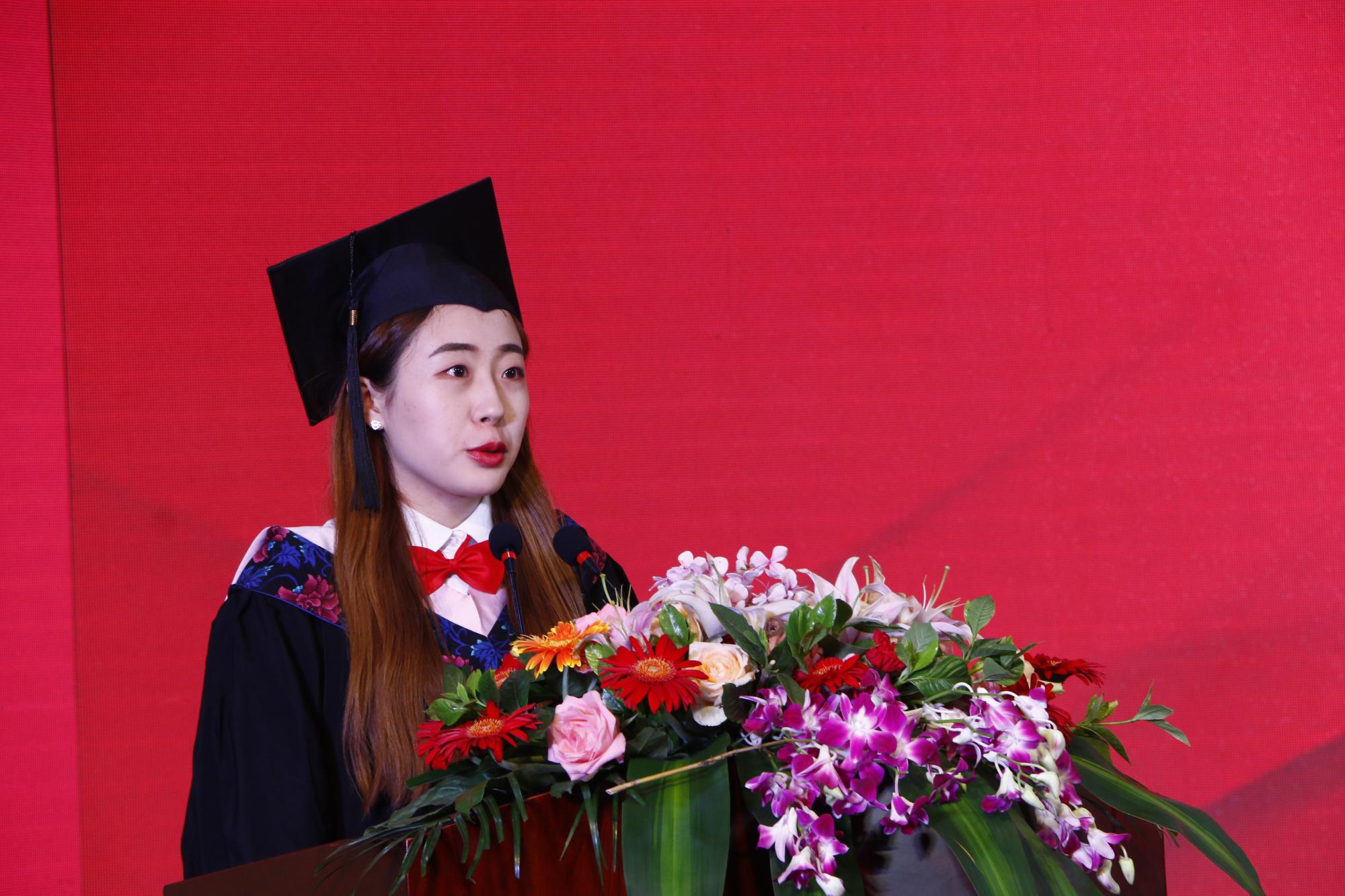 接着,优秀毕业生代表崔玙璠发言。她饱含深情,回顾了在浙财走过的四年青春。在向母校深情告白之时,她也说出了所有毕业生的心里话:无论何时,无论我们身处何地都不会忘记母校、不会忘记老师的谆谆教诲,不会忘记同学们的浓浓情意。
