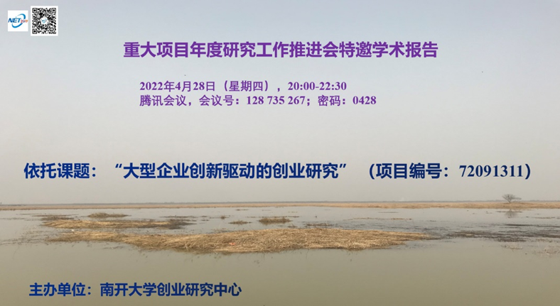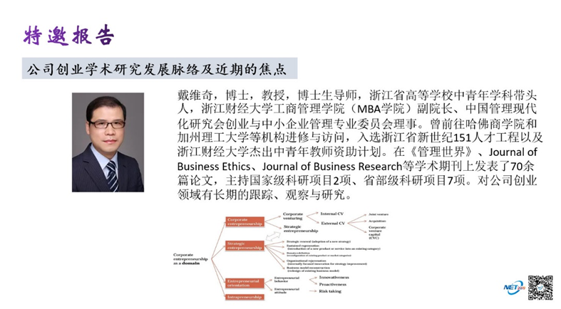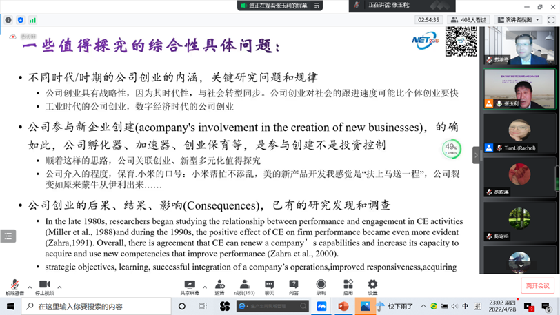 戴维奇教授作了题为《公司创业学术研究发展脉络及近期的焦点》的学术报告。受疫情的影响,本次特邀报告通过“腾讯会议”平台举行,由南开大学张玉利教授主持。南开大学、吉林大学、中山大学、浙江大学及全国其他院校300余位学者和博士生参加了本次报告会。