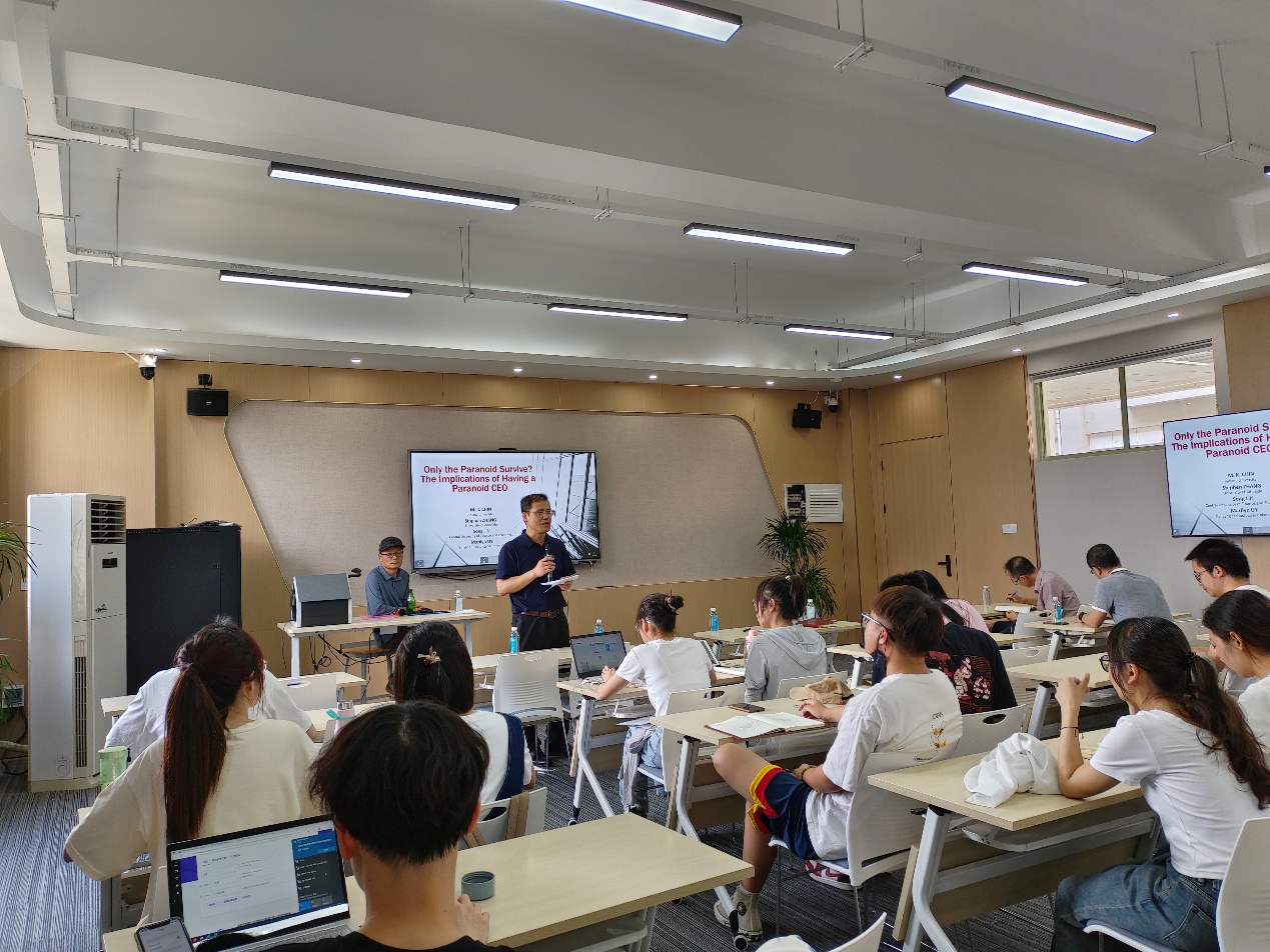 戴维奇教授、倪文斌教授、邓浩然博士等老师以及张晓萍等研究生就“企业家黑暗面与偏执的相关与差异”“本研究对于实践的指导意义”“企业生存的代理变量是否可以进一步完善”“如何避免问卷调查过程高管自我美化的问题”“疫情对于研究的影响”“如何形成论文选题” 等问题展开探讨。Stephen Zhang详细解释了论文中涉及的概念与操作化、理论机制和统计方法,并与老师学生们交流了研究经验和未来研究想法。