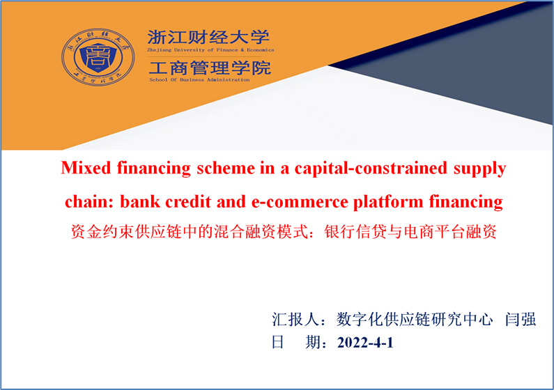 专门开设了数字管理论坛暨院级研究中心学术交流会。2022年4月1下午,数字化供应链研究中心负责人闫强博士作了题为“Mixed financing scheme in a capital-constrained supply chain: bank credit and e-commerce platform financing(资金约束供应链中的混合融资模式:银行信贷与电商平台融资)”的学术报告。