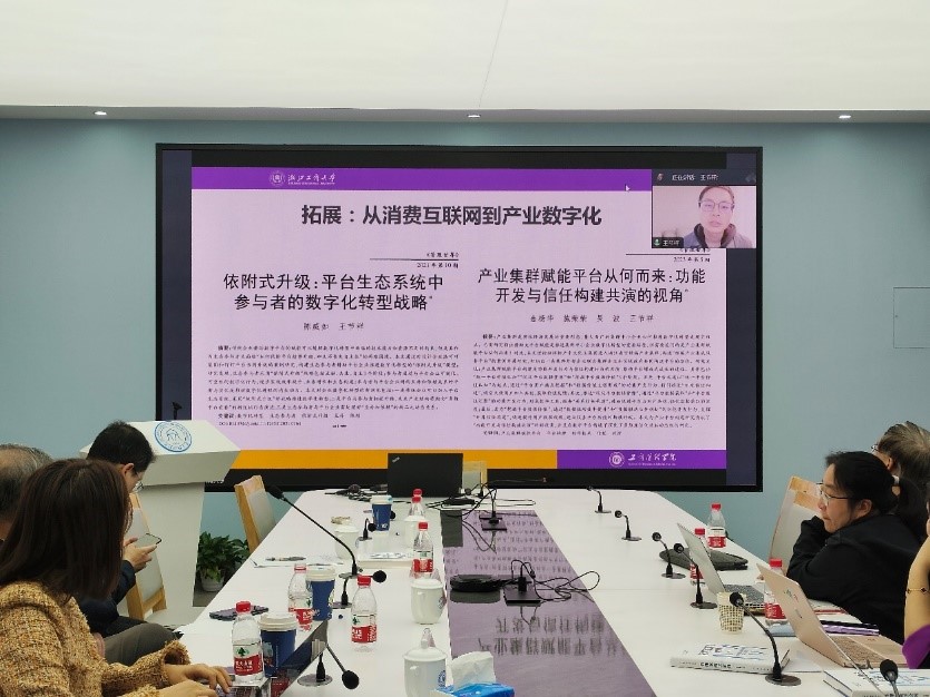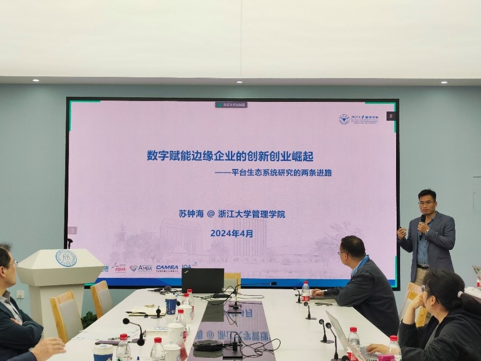浙江大学苏钟海博士以“数字赋能边缘企业的创新创业崛起——平台生态系统研究的两条进路”为题作汇报演讲。苏博士首先讲述了边缘企业如何构建平台生态系统。以微医推动中国互联网医疗制度变迁为例,剖析新兴场域平台型企业制度创业的过程机理,得出处在边缘位置的平台型企业因其平台独特性和优势能够发起制度创业,推动场域制度变迁并从中获益。其次,他以化纤邦构建化纤产业互联网平台为例,从数字商业模式创新的视角探究其构建产业互联网平台的过程机理。苏博士之后讲述了平台生态系统如何赋能边缘企业的创新创业崛起。以海尔生态系统赋能食联网为例,从赋能维度和赋能层次两个维度探讨平台生态系统对创业企业的资源赋能。其次,他分享了结合5个主流平台生态系统,采用组态分析策略开展的研究,指出平台生态系统的市场资源是其赋能互补企业创新驱动创业的必要条件。最后,苏博士对平台生态系统情境下数字赋能边缘企业创新创业崛起这一研究议题进行了展望。
