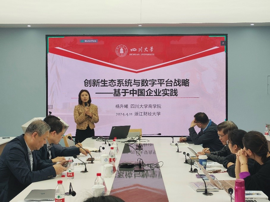 四川大学助理研究员杨升曦博士以“创新生态系统与数字平台战略——基于中国企业实践”为题,从不同的视角分享其团队关于数字平台战略方面的最新研究。杨博士从战略管理视角探讨企业的资源互补策略,指出生态系统逻辑下资源互补策略的不同、生态系统情境下的管理“集体不确定性”的重要性以及企业如何获取互补性资源。随后从互补者的角度出发,讨论其在组织边界、资源禀赋、角色差异等方面的差异,以及价值支持者如何依靠生态系统实现自己的价值创造。结合数字平台战略,杨博士引用了“钉钉”平台的案例探讨服务型数字平台对传统组织数字化转型的赋能机制,并阐述了在平台作用场域从成熟场域转向新兴场域的过程中,平台企业如何促进生态参与主体的价值共创以及如何利用平台赋能构建其生态内外双重竞争优势等相关研究。最后,杨博士分享了近期有关利用生态系统促进国有企业创新动力和效能的初步研究成果。