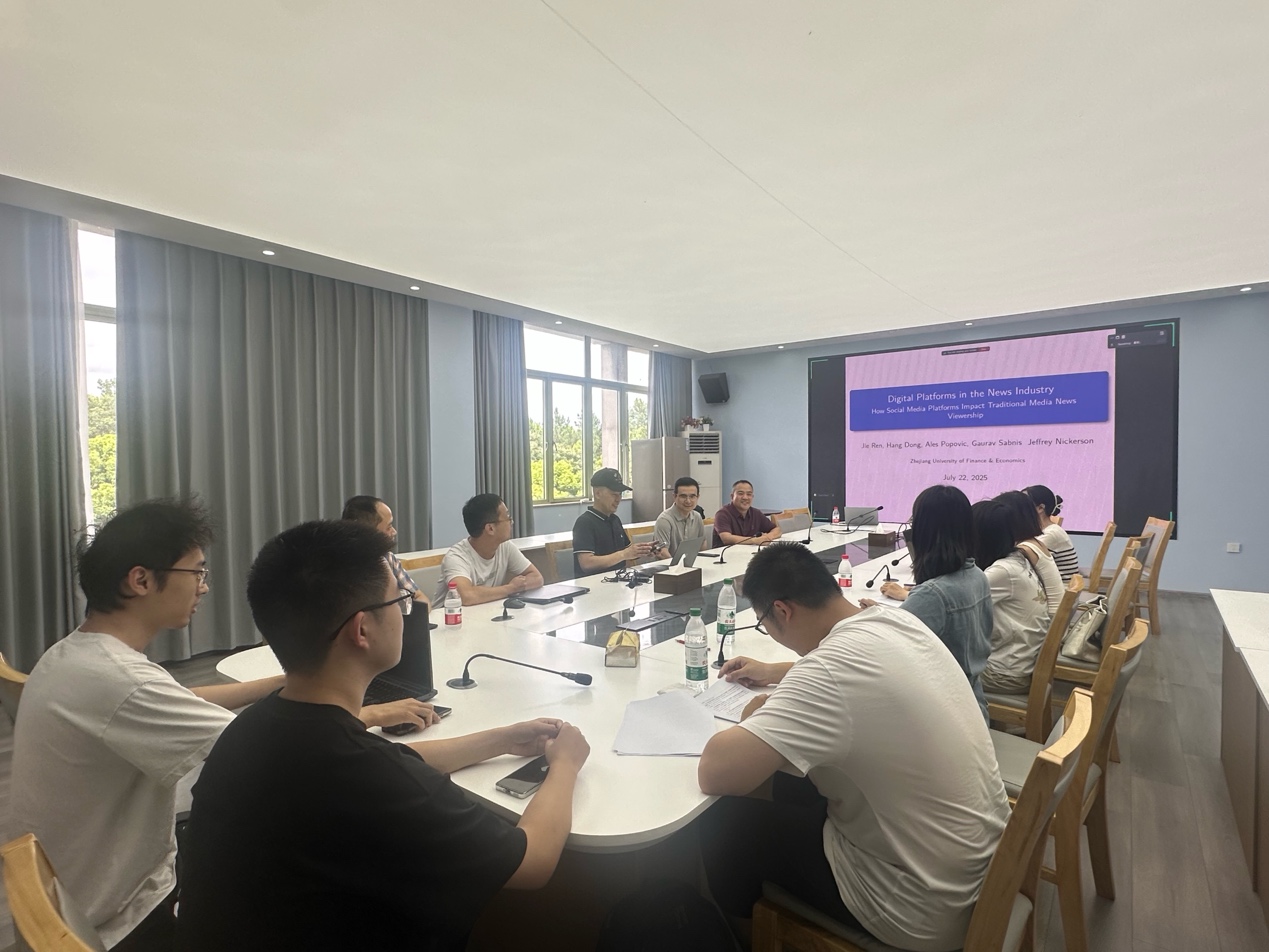 助理教授董航博士,以《从社交媒体到传统媒体:股票市场中的注意力传导机制研究》为题,向在场和线上师生进行了系统分享。讲座由数智技术与管理创新研究所所长杨水清教授主持。