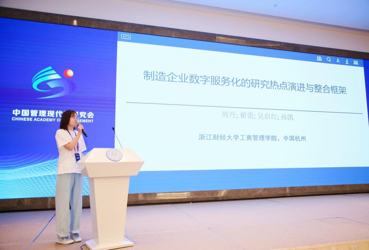 的翟蕾,她的报告题目为“制造企业数字服务化的研究热点演进与整合框架”。她认为,数字服务化起源于数字技术与服务化的交互作用,尽管制造企业数字服务化的研究正在逐步兴起,但其仍属于一个新兴的研究领域。此研究提出了制造企业数字服务化的一个整合性研究框架,为主题之间的相互联系提供了新的逻辑。