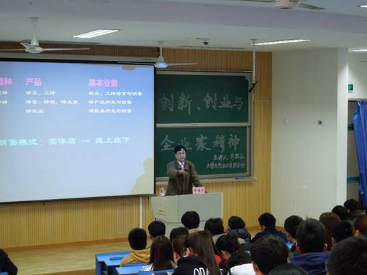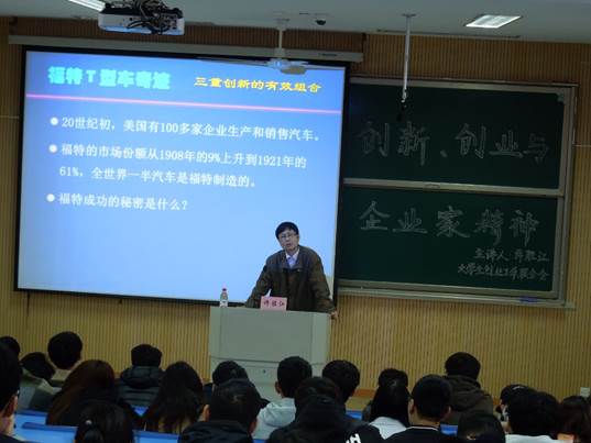 许胜江老师为该校学生做了一场题为“创新、企业家精神与创业”的讲座。这场讲座用九个生动形象的创新创业故事取代枯燥空洞的理论说教,为同学们呈现了创新、企业家精神与创业之间的内在联系,体现了教师以学生为中心的教学理念和在在课程设计与教学中的良苦用心。两个小时的讲座,博得了热烈的掌声。