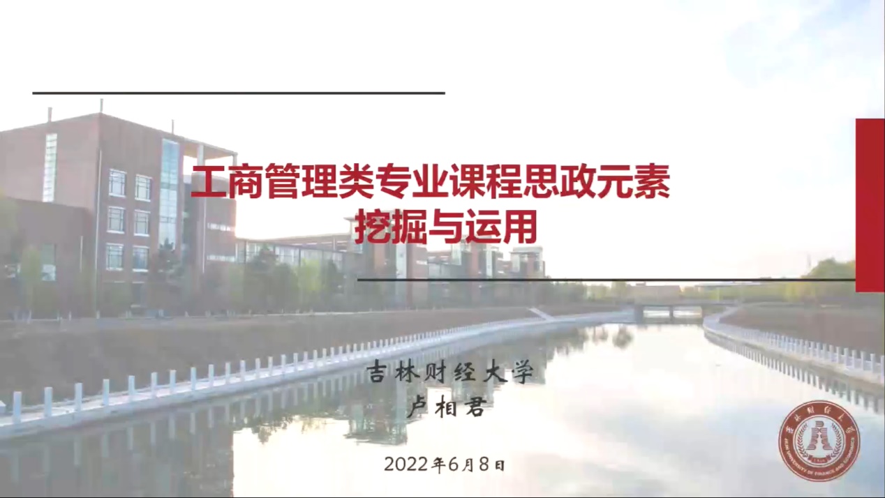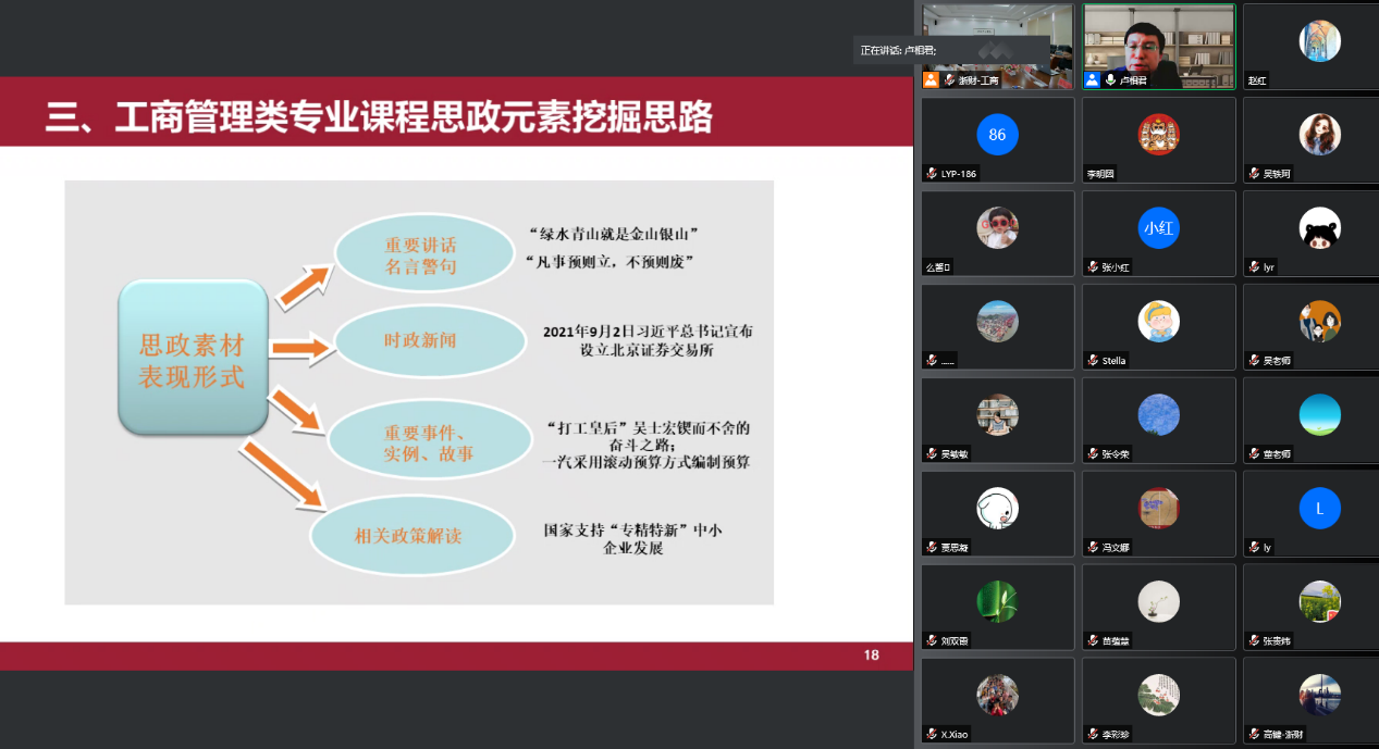 卢相君教授从“工商管理类专业课程思政建设依据“、”工商管理类专业课程思政元素体系“、”工商管理类专业课程思政元素挖掘思路“、”工商管理类专业课程思政元素挖掘与运用示例“、”工商管理类专业课程思政教学方法“这五个方面进行阐述。