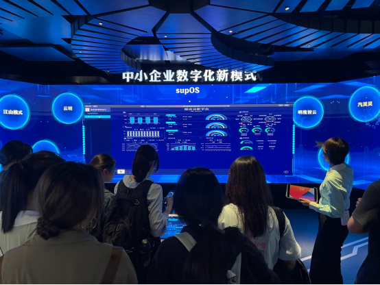 步入二层,首先映入眼帘的是未来工厂体验区,在这里可以看到由五个单位机器组成的智能产线,背后的大屏幕上时时跳动着诸如“订单管理”、“物料监控”、“生产效率”之类的多项数据。然后进入制造业数字化体验中心,这里展示了各种制造业数字化的详细案例。同学们还饶有兴趣地亲自下场参与互动,体验了数字化缝纫机、虚拟的物流仓储、总裁云办公驾驶舱、全息投影的裸眼3D红船、时光隧道等多个项目。