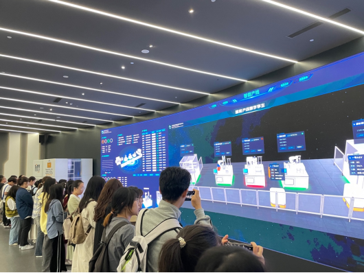 一进入能力中心,同学们被里面的各种高科技设施震撼到了。整个展厅分为两层。第一层是大屏显示中心,工作人员先播放了一个短片,同学们从中了解到华东地区已将智能产线产业链推广至中国的西北、华中、华南地区乃至全球其他国家,深深感受到数字化给制造业带来的巨大改变。随着严丝合缝的大屏徐徐打开,大家才发现这原来是一道门,通过宽阔的楼梯可以直接上到第二层。