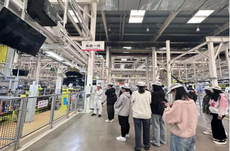 在参观完焊装车间后,同学们又来到了总装车间,亲眼见证了地盘自动合车、风挡玻璃安装、座椅自动投放、车身自动底涂系统的自动化、智能化、高效化工艺过程。