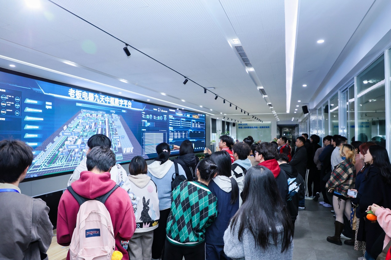 师生一行在企业导游的带领下沿着专门设立的工业旅游通道参观了企业的数字化智能制造无人工厂、智能物流仓储中心、全球烹饪艺术中心、产品艺术馆。在数字化智能制造无人工厂、智能物流仓储中心,师生一行对其先进的数智化制造叹为观止。无人工厂偌大的车间处于“黑灯”状态,一辆辆AGV(自走式车辆)在车间里有序穿行,几乎所有的制造、加工、拼装任务都由被预设了程序的高科技机器完成,并且由老板电器九天中枢数字平台实时监控。智能物流仓储中心是行业内最大、智能化程度最高的智能物流仓储中心。相当于11层楼高度的货架极具视觉冲击力。中心采用自动引导车、循环牵引车、穿梭货架以及自动空中物流系统等多种先进装备和技术,同生产执行系统深度融合嵌入,自动校料、配送、入库优化,实现精益化生产。老板电器无人工厂打造了领先的工业互联网平台——九天中枢智能平台,以用户为核心,数字驱动业务为基础,实现市场与用户零距离、研发与用户零距离、制造与用户零距离,成为行业数智化制造的新标杆。