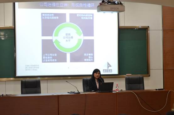 217报告厅顺利召开。讲坛有幸邀请到亚洲公司治理协会的高级研究员李睿女士为同学们做主题演讲,活动由市场营销系主任、基地负责人陈颖老师主持。