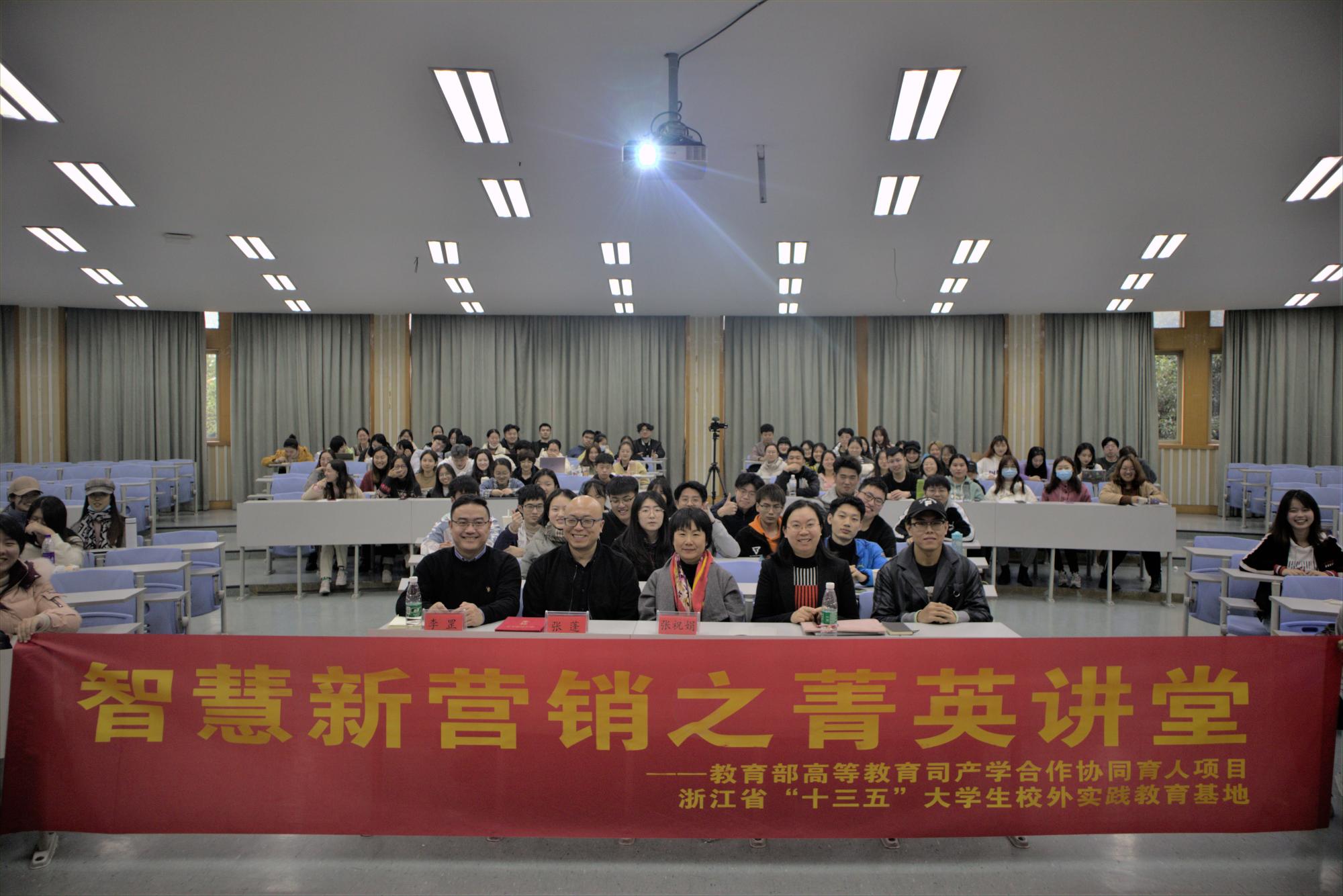 楼115报告厅进行了《浅谈智慧新营销》主题报告、教育部产学合作协同育人项目揭牌仪式及“职业经理人”导师聘任仪式。本次活动由浙江省“十三五”省级大学生校外实践教育基地负责人,市场营销系主任陈颖副教授主持,18和19级中美市营、工商管理等专业近百余名同学参与活动学习。