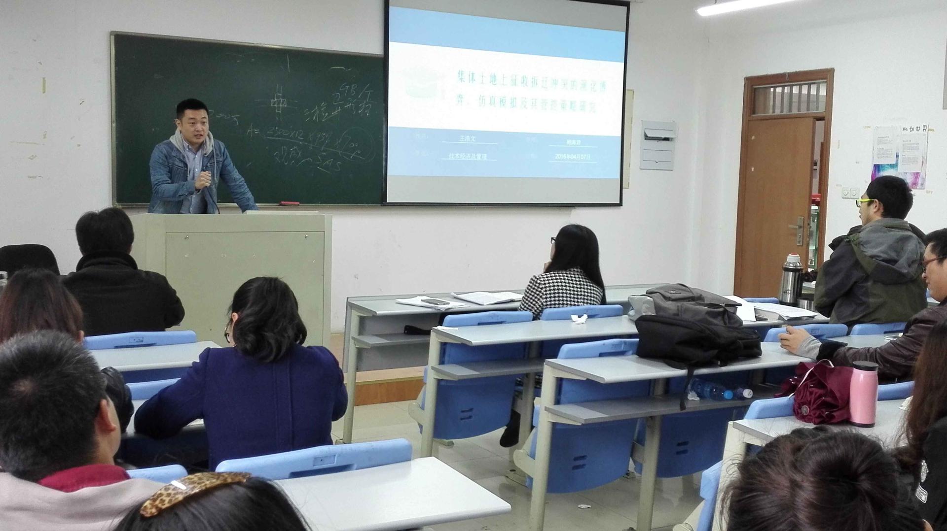 14、15级研究生参加。三位主讲人依次以精心准备的PPT形式向大家展示了各具特色的学术论文成果。杨柏松同学的交流论文题目为《高管激励、创新投入与企业绩效——基于创业板企业的实证研究》,王秋欢同学的交流论文题目为《绿色广告信息策略对购买意向的主效应与交互效应研究》,王浩文同学的交流论文题目则为《集体土地上征收拆迁冲突的演化博弈、仿真模拟及其管控策略研究》。在座研究生们积极参与了讨论与提问。王建明老师和冯娟老师都进行了一一点评,并就其论文中存在的问题提出了具有针对性的建议。