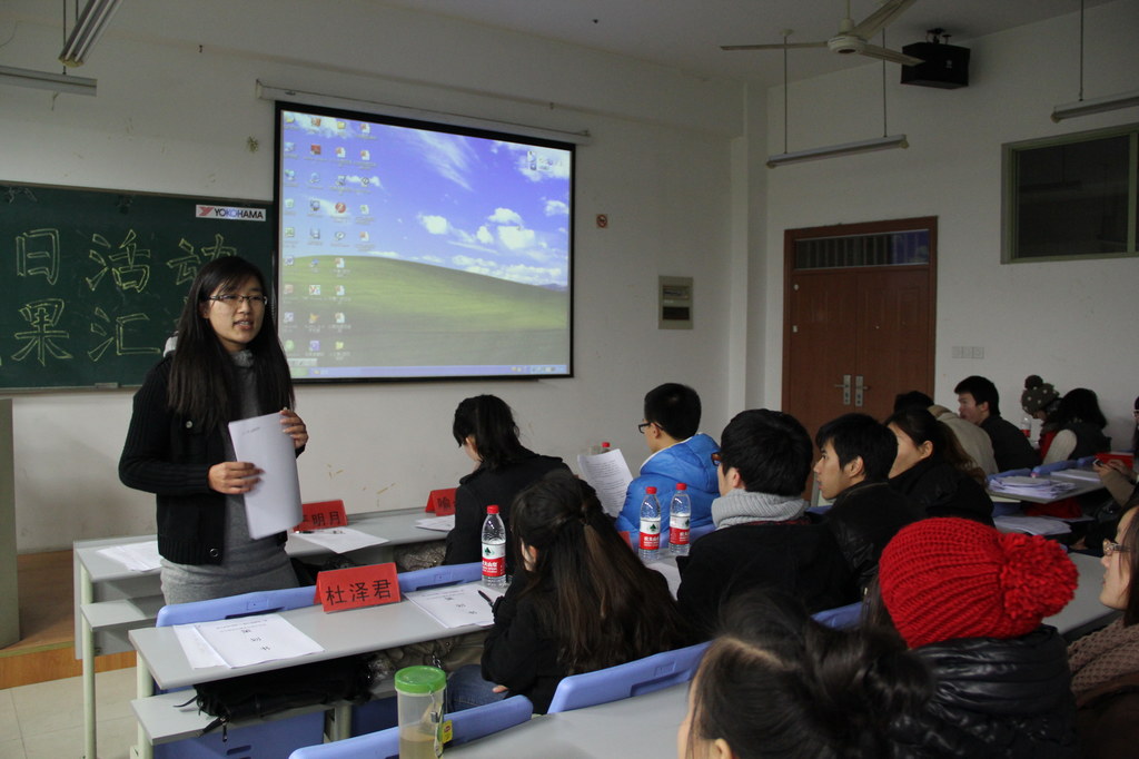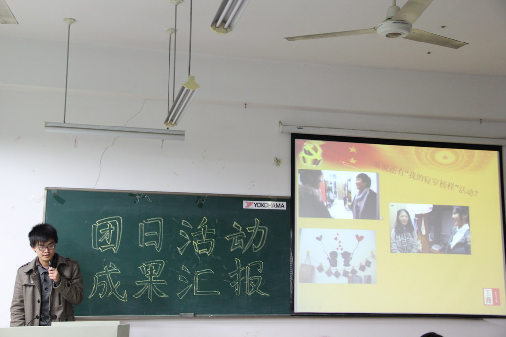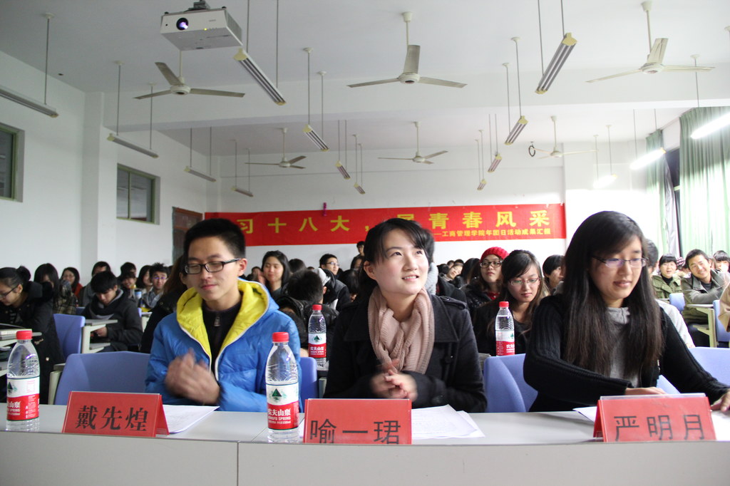 随即,展示活动正式开始。本次活动共有团支书PPT演讲、班级风采展示、答辩和颁奖四个环节。9个班级的团支书依次上台进行了精彩的演讲。从分发十八大传单到观看《建党伟业》,从走访优秀寝室到“十八大之我见”PPT演讲活动,团日活动之精彩,准备之精心由此可见一斑。在接下来的班级风采展示中,KT板展示、红歌演唱、口号呐喊等都将活动气氛推向了高潮。