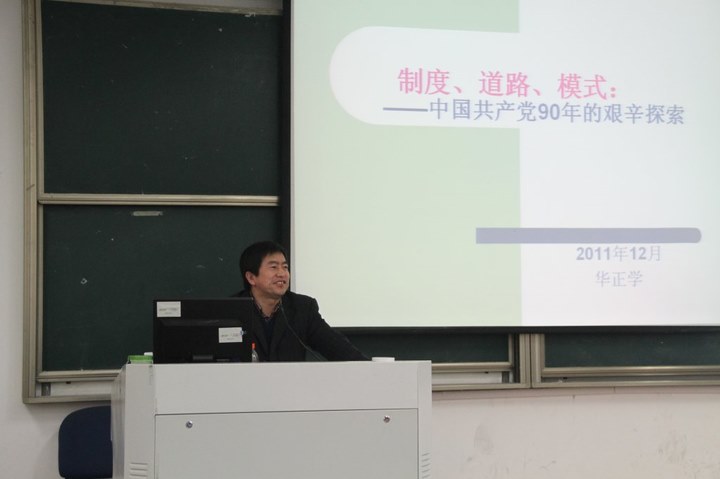 在一片热情的掌声中,华教授开始了本次的党课教学。首先他带领同学们回顾了本年度的两件大事:中共成立九十周年和辛亥革命一百周年。随后,华正学教授从中国旧民主主义革命的失败及教训,到新民主主义革命选择社会主义的必然性,再至社会主义新中国的建立,以时间为主轴,使同学们的思绪横跨历史长河,回顾了我们国家的艰辛岁月。演讲中,华教授抓住“制度,道路,模式”三个关键词,展开一系列中国特色社会主义之路的探索与建设,由浅及深,指出办好中国的事,关键还是在于党的真理。
