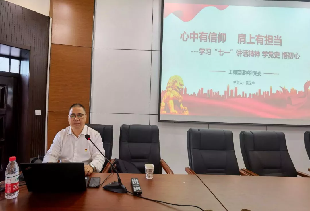 高燕老师进行授课。黄卫华老师以“心中有信仰,肩上有担当”为主题,意在指引学员们通过学习“七一”讲话精神来了解党史,不忘共产党员们的初心。他首先以习近平总书记在“七一”的重要讲话为引,带领学员们回顾共产党带领人民长期以来艰苦奋斗的光辉历史和伟大成就,领会共产党员们不懈努力的精神气魄。然后他借“九个必须”根本要求强调了“以史为鉴,开创未来”的重要性。最后,他希望大家能积极响应习近平总书记的伟大号召完成“奋进新征程,建功新时代”的目标。