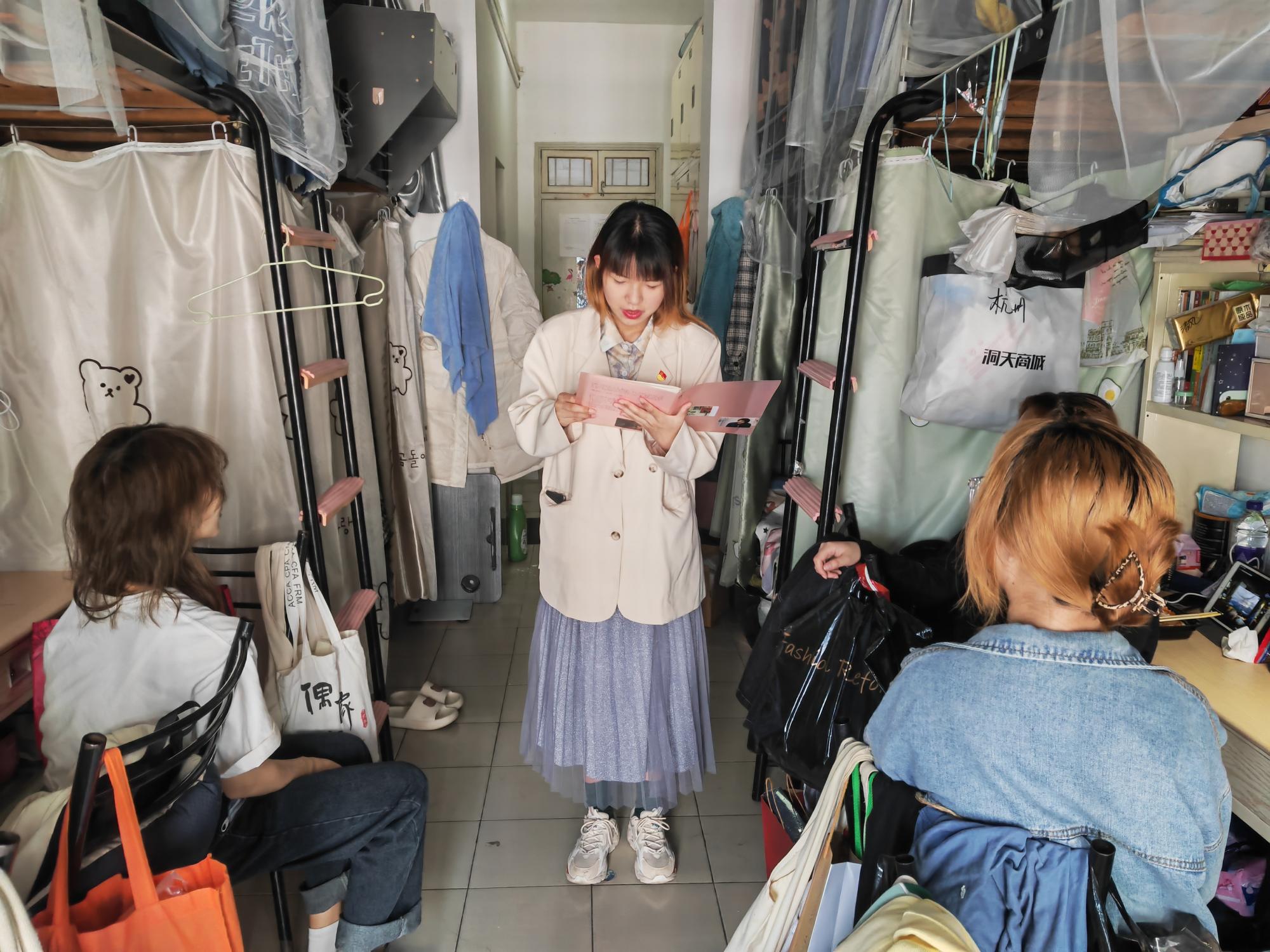 在成蹊苑49幢楼,学生第二党支部学生党员胡晓丹和学生第三党支部学生党员郭思嘉,走到21级学生宿舍内,做起了“两会”宣讲员。从“两会是什么?两会干什么?”到“今年两会重点内容、热点议题”;从“民生热点”到“大学生就业创业”;从“新发展格局”到“十四五发展规划”…小小宣讲员们结合自身的学习体会,向大家解读了全国两会精神。