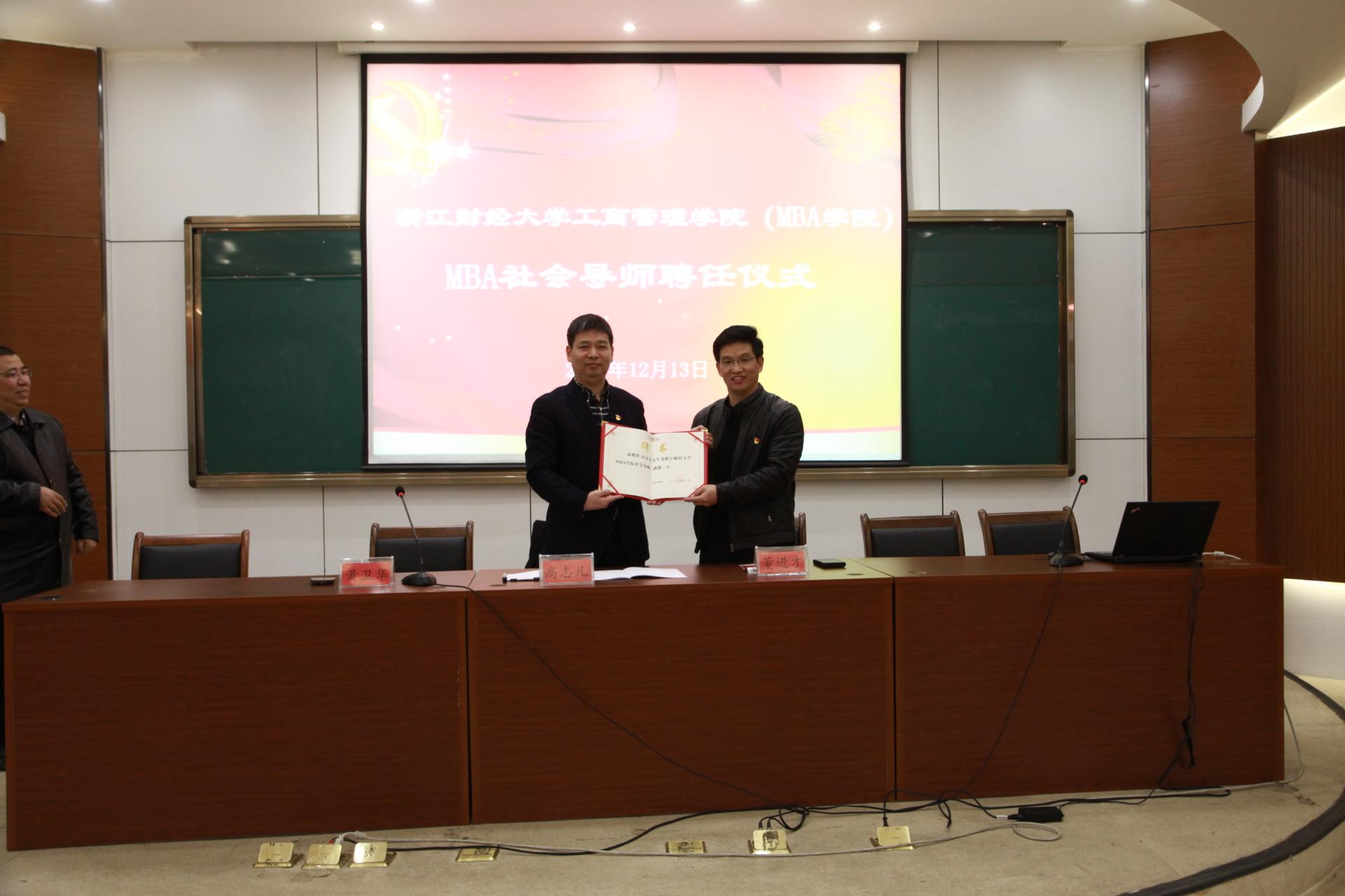 院长董进才为其颁发了MBA社会导师聘书,开启了双方友好合作的第一步。