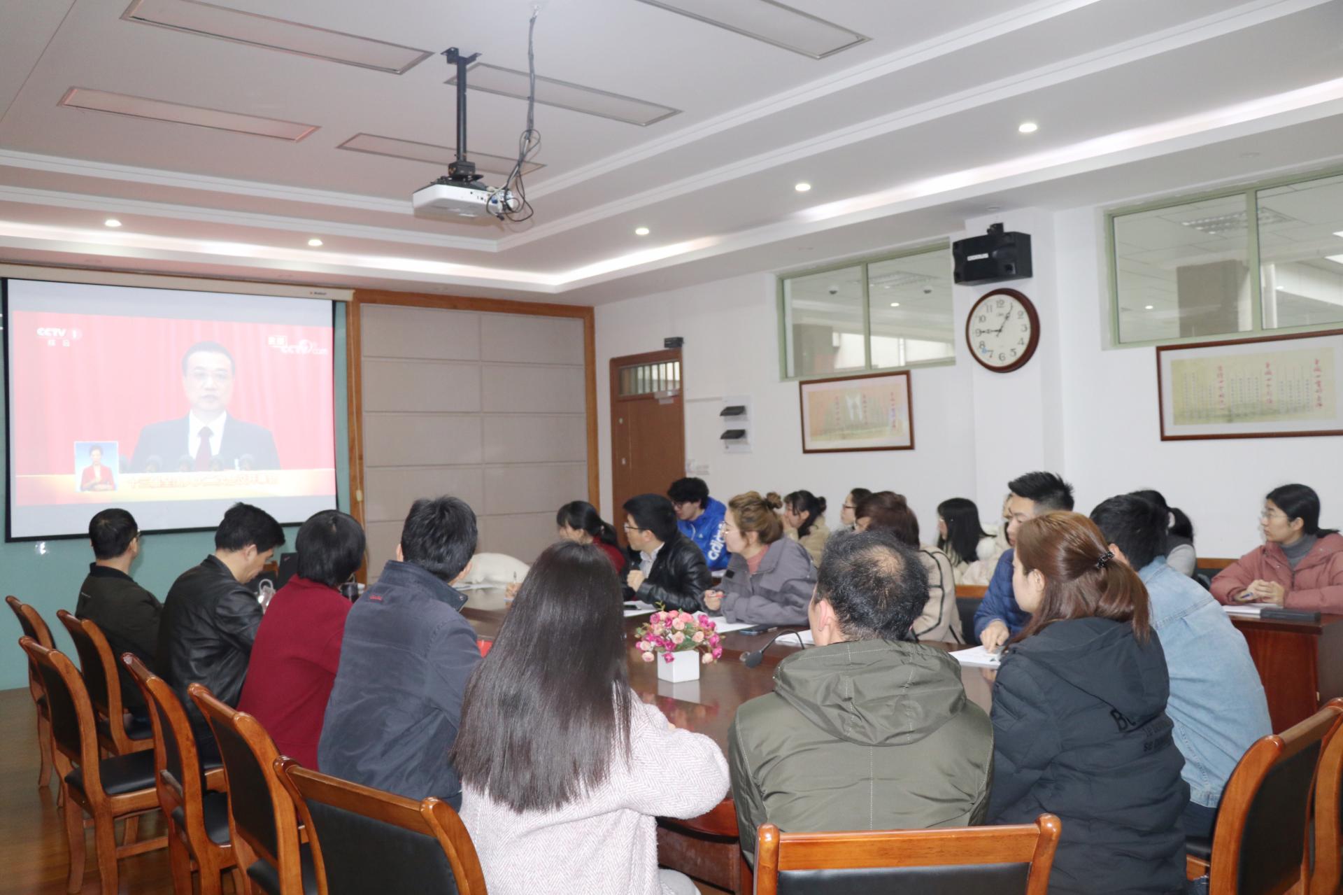 随后,师生凝神静听李克强总理作政府工作报告。李克强总理在报告中回顾了2018年的工作,报告了2019年经济社会发展总体要求和政策取向,布置了2019年政府工作任务。他指出,奋斗创造历史,实干成就未来,我们要更加紧密地团结在以习近平同志为核心的党中央周围,高举中国特色社会主义伟大旗帜,以习近平新时代中国特色社会主义思想为指导,迎难而上,开拓进取,以经济社会发展的优异成绩迎接中华人民共和国成立70周年,为决胜全面建成小康社会、夺取新时代中国特色社会主义伟大胜利,为把我国建设成为富强民主文明和谐美丽的社会主义现代化强国、实现中华民族伟大复兴的中国梦不懈奋斗!