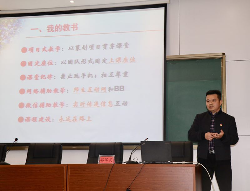 随后,郭军灵老师以“教书育人:我的体会”为主题,从“我的教书”、“我的育人”、“我的体会”三大方面向在场同仁们介绍了从事营销教学工作多年来的心得。郭军灵老师从创新课堂形式、实现新媒体教学、互动教学信息等多个角度分享了他努力成为学生成长成才的引导者的经验与体会。