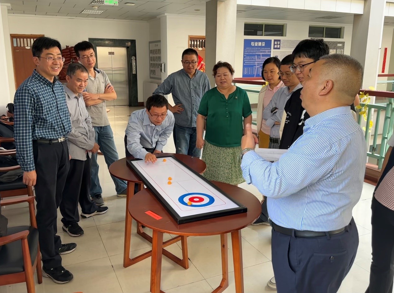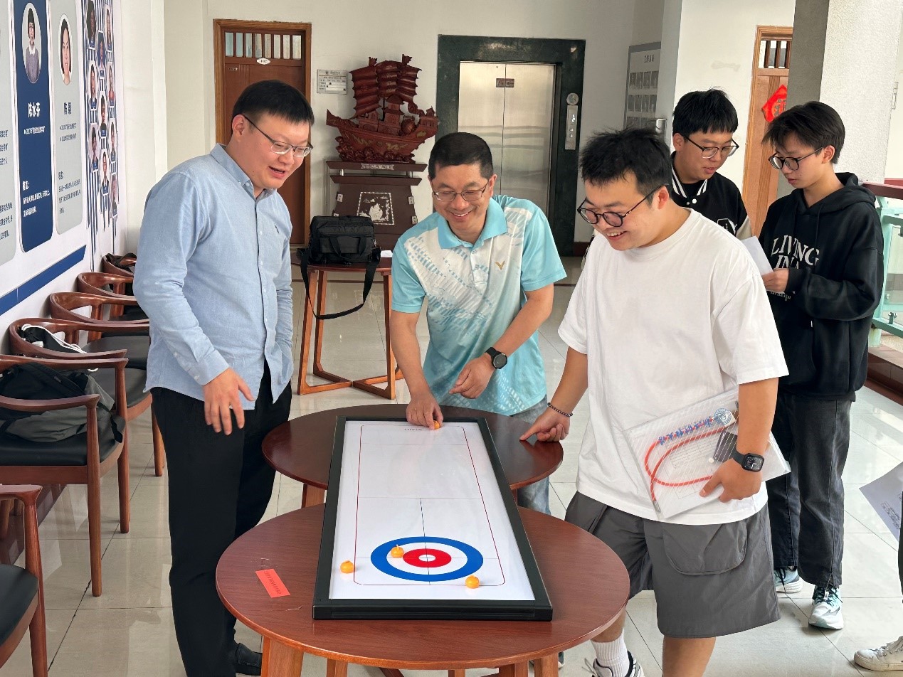 领导和老师在一块小小的桌面冰壶场地上大展身手。比赛开始前,参赛选手轮流上场,亲手体验并互相分享技巧心得。比赛开始后,参赛选手迅速进入比赛状态,赛场精彩纷呈,现场喝彩欢呼声音持续不断。