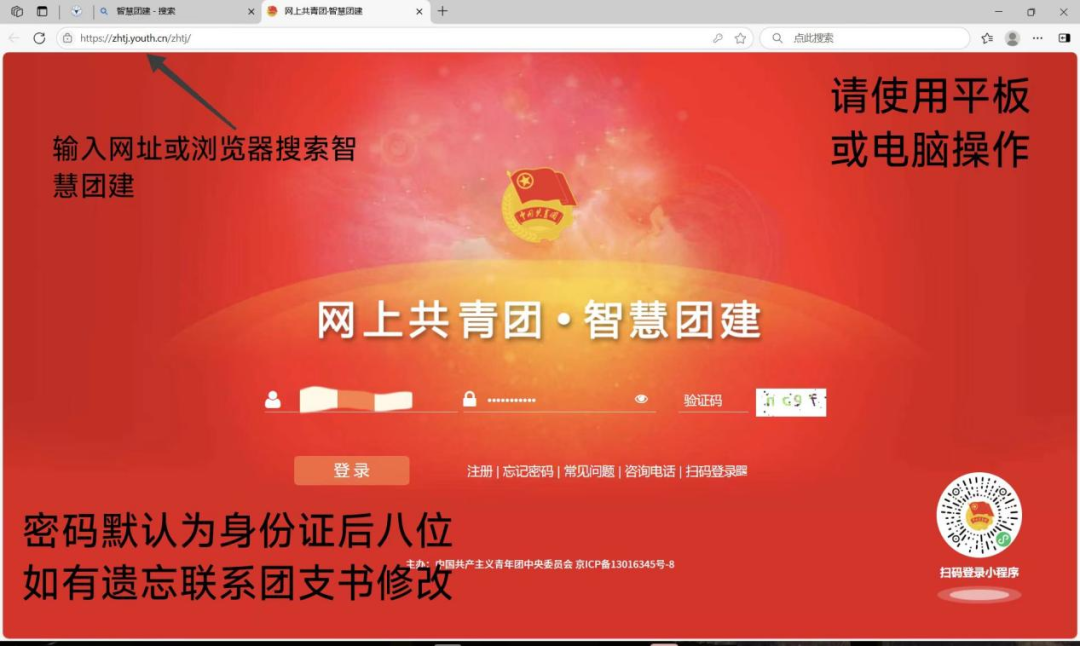 输入自己的身份证号码与密码(初始密码为身份证号后8位),如忘记密码请务必寻找团支书重置。