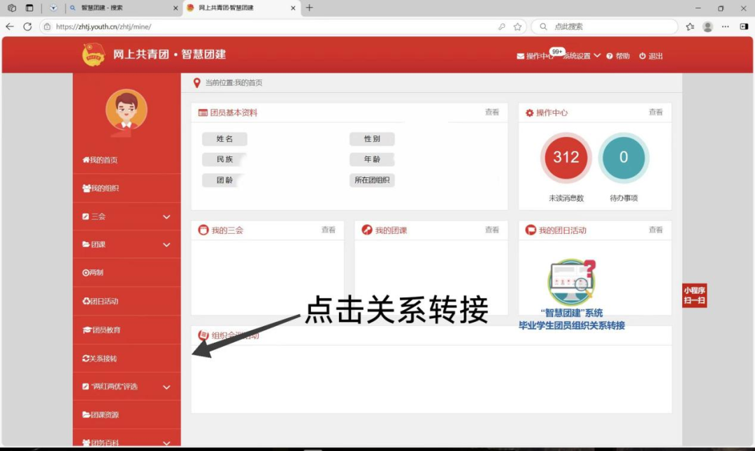 2. 团员个人发起(个人中心→关系转接→组织关系接转办理→完成申请→等待审核)