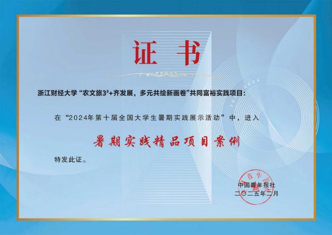 ‘农文旅33+齐发展,多元共绘新画卷’共同富裕实践项目”获评“2024年全国大学生暑期实践精品项目案例”称号。