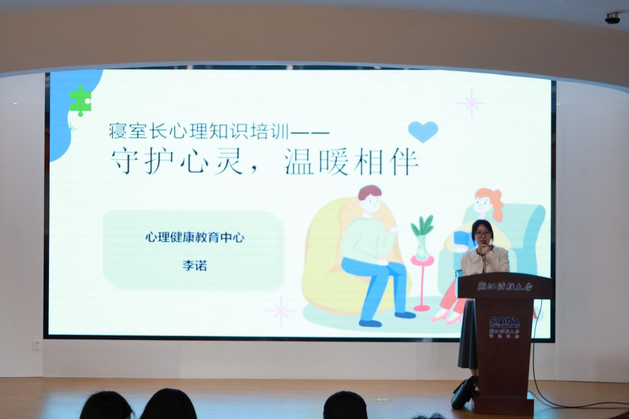 首先邀请了来自校心理健康教育中心的李诺老师对寝室长进行授课。在这场以“守护心灵、温暖相伴”为主题的寝室长心理知识培训中,李诺老师采用活泼有趣的授课方式帮助各位寝室长们理清工作职责、掌握工作方法,以期发挥朋辈力量共促心理健康发展。