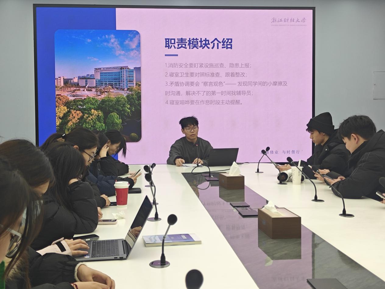 培训围绕四大职责模块展开:消防安全巡查与隐患上报、寝室卫生检查与整改督促、同学矛盾协调与及时上报、作息时段秩序维护。同时,会议明确了网格员的奖励机制,包括基础分与绩效分两部分,鼓励大家积极履职、主动作为。