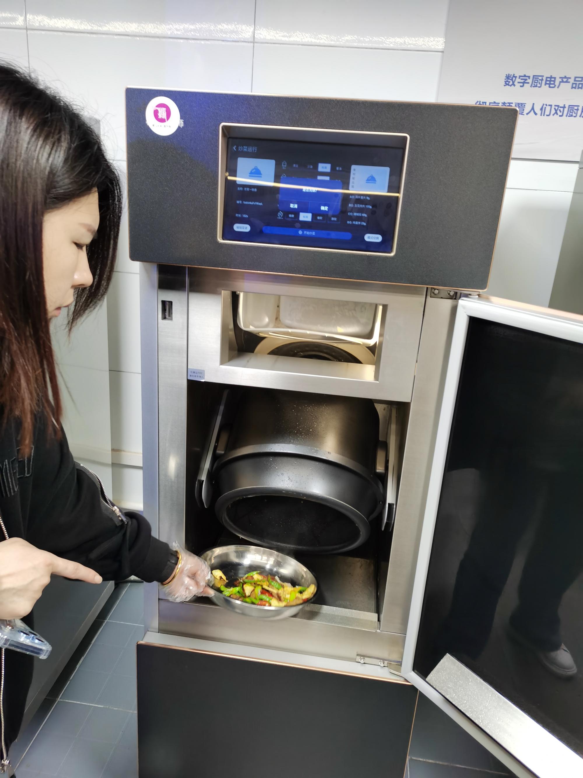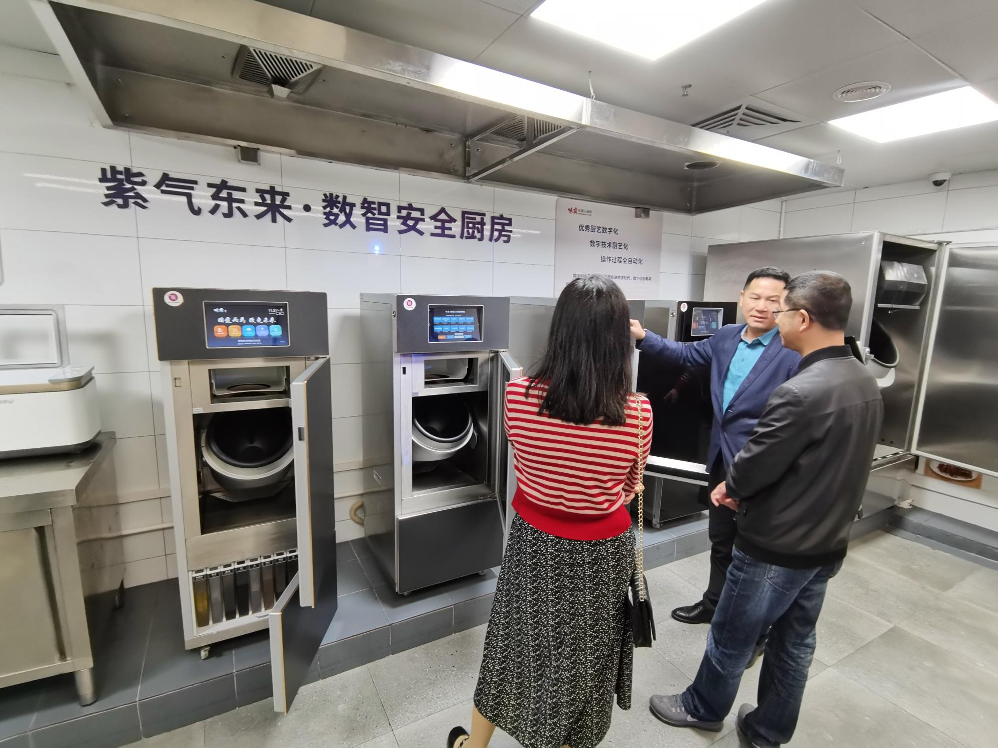 梁阿军总经理向黄书记一行介绍了“紫气东来·数智餐厅”,带领大家参观了“时光走廊”和数智餐厅,并体验了AI智能炒菜机器。味霸机器人不同于普通炒菜机,首创了烹饪工艺数码化,菜谱指令可编程技术,炒菜过程无油烟技术,口味调整人工智能技术。机器人厨师通过网上云空间里的海量菜谱,可以做出层出不穷的各式菜肴,而且还具有绿色、智能、便捷的特点。紫光集团董事长黄勇表示,味霸炒菜机器人实现了厨师的标准化,公司正在整合从中央厨房-冷链运输-餐厅后厨-机器人厨师炒菜-出餐-分装的全过程可溯源的管控体系,从新式厨房的设计到供应链的整合实现可复制的未来数字化智慧餐厅。