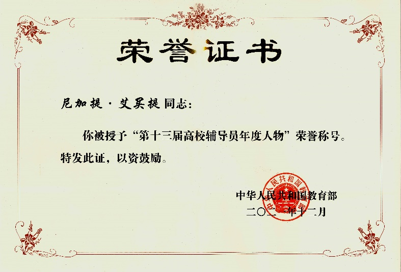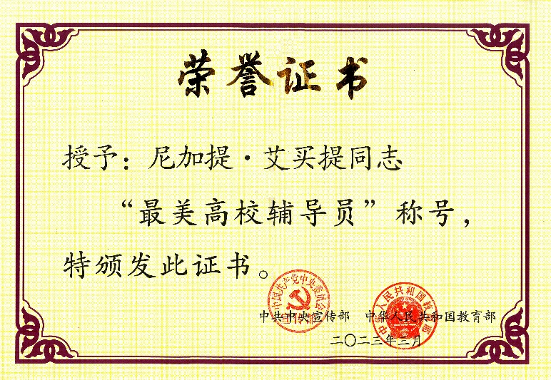 2008届校友尼加提·艾买提获评“高校辅导员年度人物”和“最美高校辅导员”。3月31日,中央广播电视总台在科教频道(CCTV-10)播出了“闪亮的名字2022---最美大学生/最美高校辅导员发布仪式”,3月31晚的《新闻联播》也进行了相关报道。
