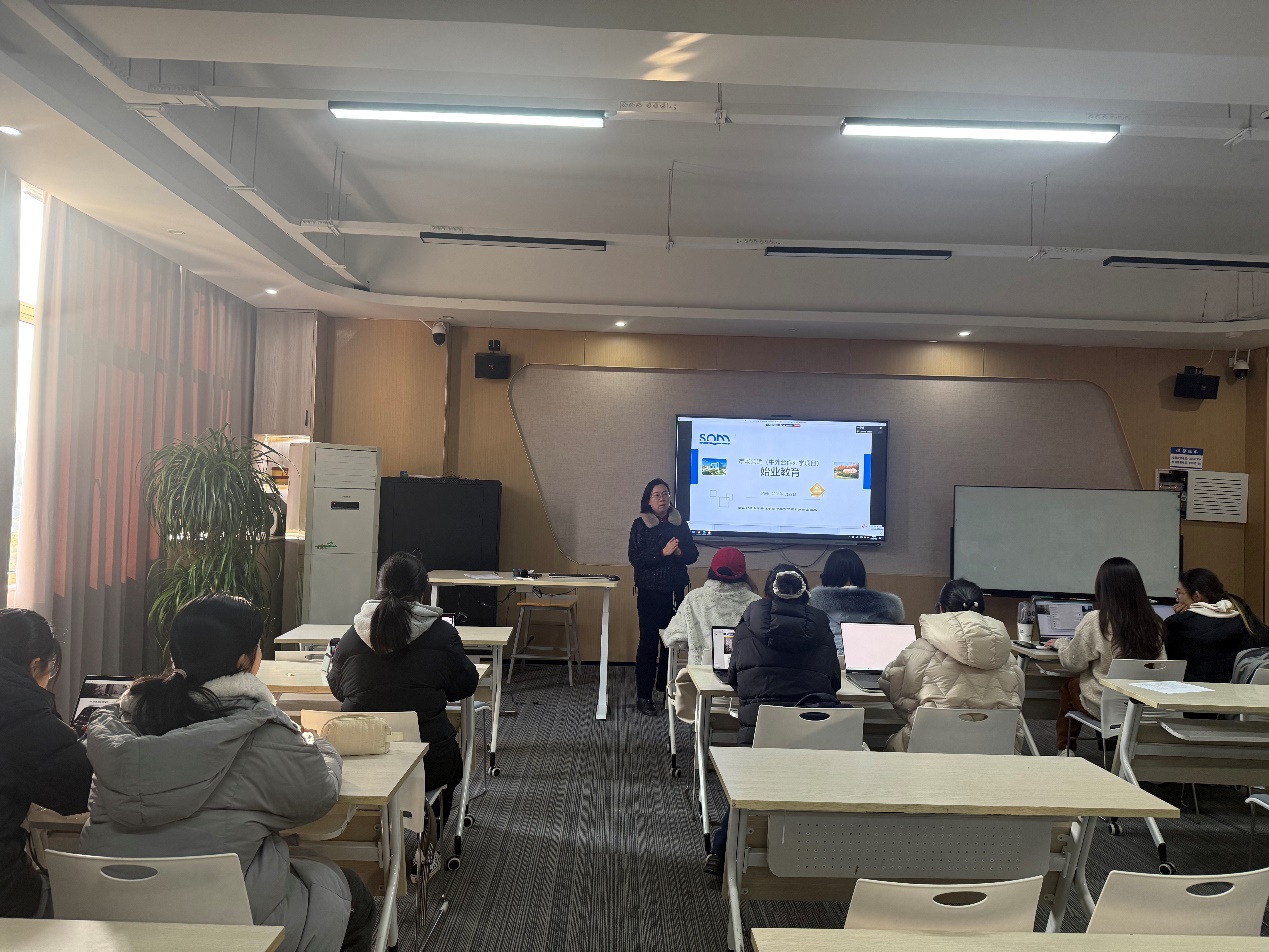 会上,中美市营项目负责人陈颖老师首先围绕项目运行情况,对中美市营合作项目的培养模式、项目组成员分工进行了系统介绍,并结合历年培养成效,对奖学金评定政策、学生出国交流安排及近年考研升学情况作了详细解读。她鼓励同学们充分利用中美市营合作办学平台资源,提前规划学业发展路径,在夯实专业基础与提升语言能力的同时,持续拓展国际视野,不断增强自身综合竞争力。