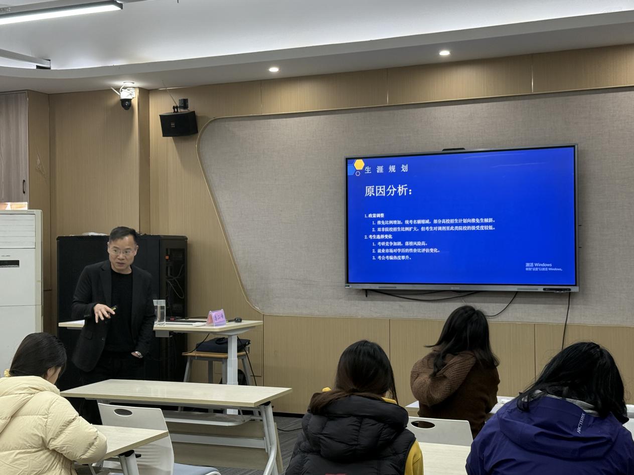 在主题讲座环节,嘉宾潘江峰围绕当前国内外升学趋势与商科留学路径展开深入分析。他结合近年来考研与留学数据变化,指出学生在学业规划中应更加注重“路径匹配”与“资源利用”。讲座从绩点管理、语言考试安排、科研与竞赛参与、实习经历积累等多个维度进行了系统讲解,构建了清晰的留学准备框架,并强调应尽早进行阶段性规划,在本科阶段逐步完善个人背景,以提升申请竞争力。