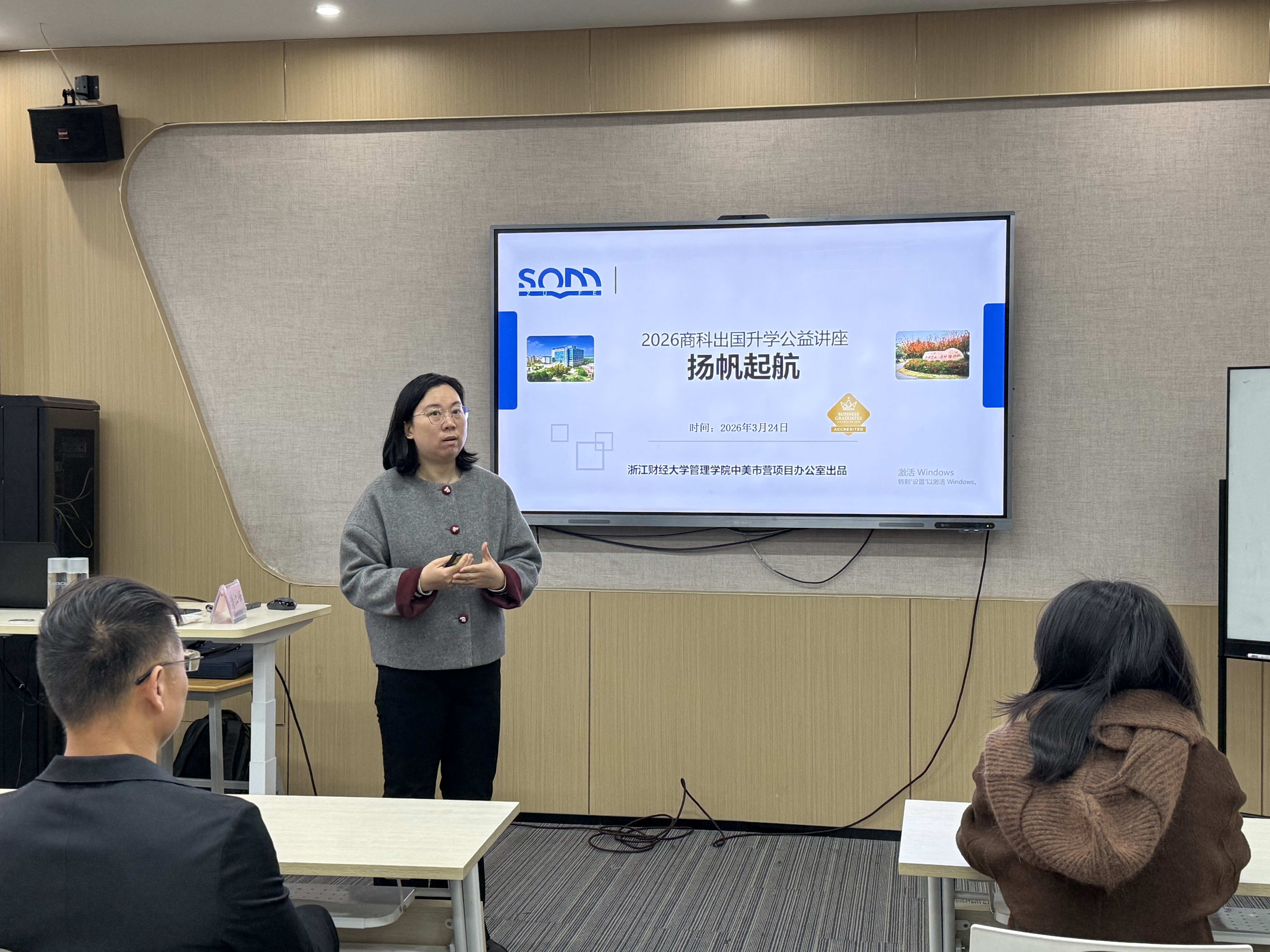 楼5411举办“扬帆起航——商科出国升学规划分享会”。本次活动由项目主任陈颖主持,特邀国际教育专家潘江峰担任主讲嘉宾,并邀请赴UT学生代表刘碧涵进行分享,吸引了中美市营项目多届学生积极参与。