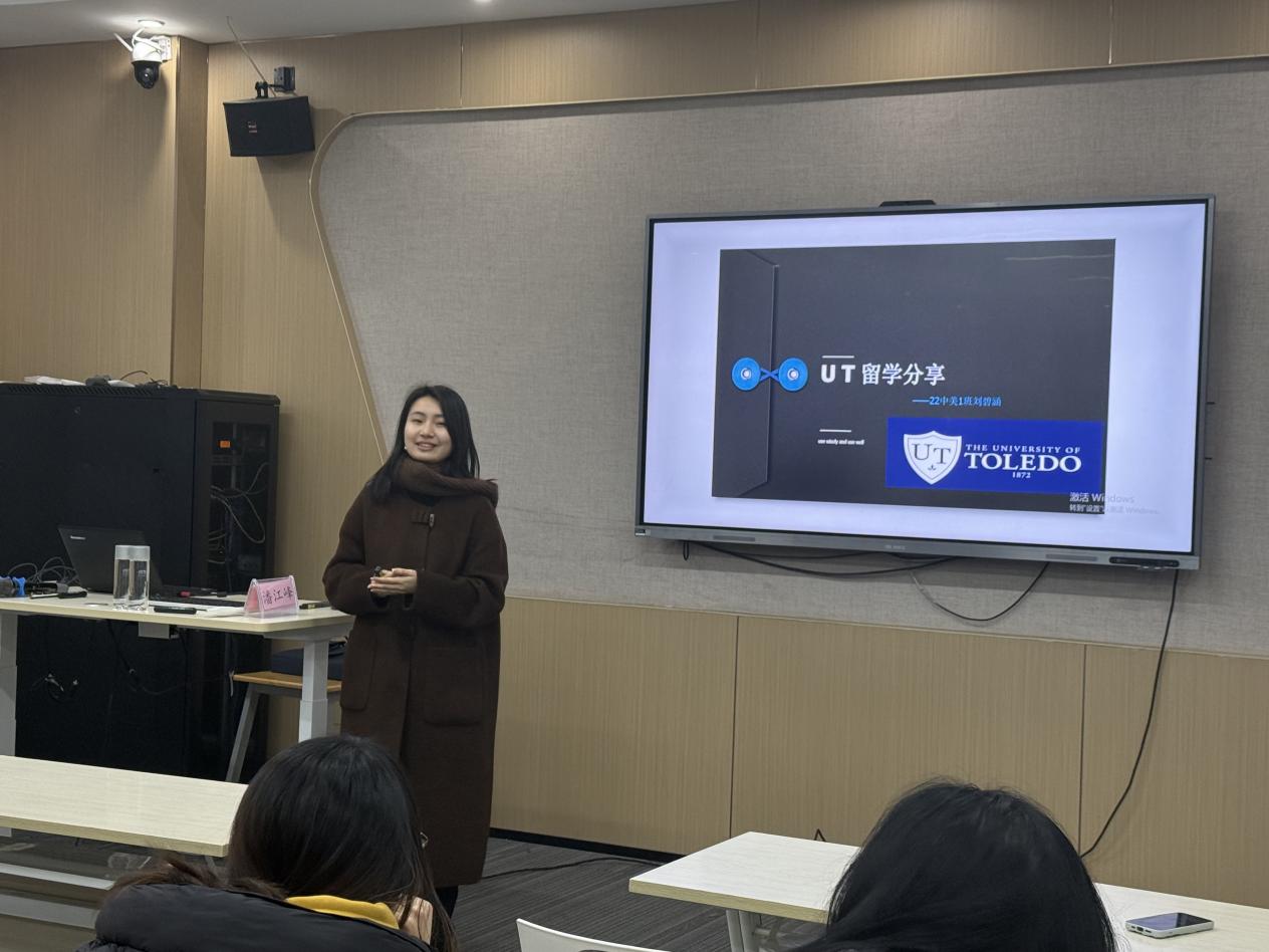 随后,赴UT学生代表刘碧涵分享了其在美国托莱多大学一年的学习与生活经历。她从课程结构、课堂形式、专业能力培养以及职业发展支持等方面进行了具体介绍。她提到,托莱多大学在专业销售与职业能力培养方面具有鲜明特色,通过大量实践性课程与展示任务,有效提升了学生的表达能力与综合素养。同时,她也分享了赴美前的准备事项与学习建议,为有意向出国交流的同学提供了切实参考。