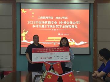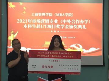 此次市场营销(中外合作办学)本科生赴UT项目奖学金共评出一类奖金获得者1名,二类奖金获得者1名。黄卫华书记为2018级的韩若清和张子璇两位获奖同学分别颁发了相应的奖励,分别为1.5万元和1万元,以表彰两位同学去UT学习。