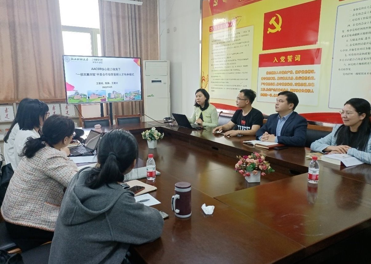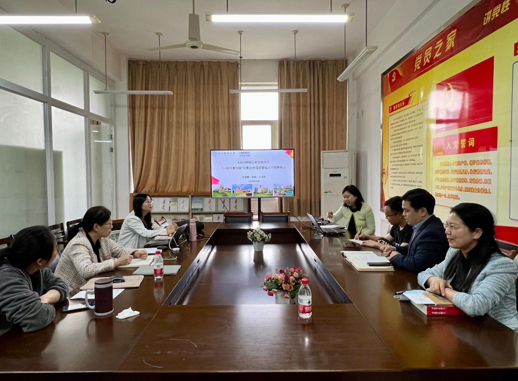 王建国首先整体介绍了中美营销项目运行十年所取得的成果,梳理了项目特色与优势。陈颖结合中国高校市场学会教学年会提报的《AACSB核心能力视角下“一核双翼四驱”中美合作项目营销人才培养模式》全国三等奖作品,以及六合彩预测