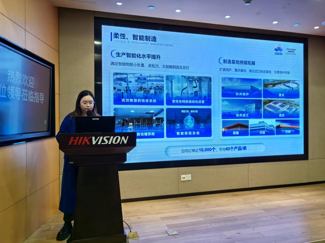 校友、校企关系经理张曼、招聘专员罗丹对老师和同学的到来表示热烈欢迎。随后,大家在主持人杨岚的带领下前往海康威视三期展厅参观学习。展厅以先进的全息投影、人机交互等模式生动地展现了海康威视在“视频结构化”“智能物联网技术谱系”等领域的先进成果。从“数字企业”“智慧城市”“未来展望”等多个板块全面而立体地展示了海康威视企业的面貌,层次分明,循序渐进,让同学们流连忘返。