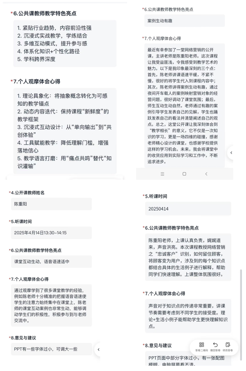 课后交流环节,教师们围绕教学案例设计、师生互动等环节展开热烈讨论,陈重阳老师结合多年教学经验,分享了以学生为中心的教学设计理念,通过案例分析和小组讨论,培养学生分析问题、解决问题的能力,能够运用所学知识对实际案例进行深入剖析,并提出有效的解决方案。提高学生的团队协作能力和沟通表达能力,在小组讨论和代表发言过程中,学生学会与他人合作,分享观点,清晰地表达自己的想法。