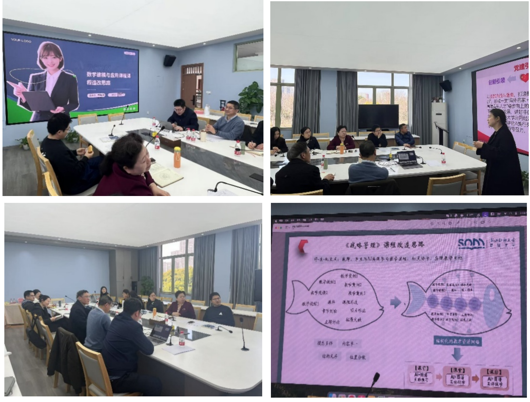 新的人才培养目标,为后续的专业改造工作指明了方向。随后林与川老师分享了《数学建模与应用》课程的建设情况。林老师详细阐述了从教学安排、考核评价,到拟开设的交叉活动以及课程资源建设等多维度的课程改进思路,尤其重点探讨了如何巧妙借助AI工具辅助教学,引发了在场老师们的热烈讨论。紧接着,俞萍萍老师介绍了《战略管理》课程在“AI+”方向的改造思路,创新性地提出构建结构化的教学资源网络,以及打造“AI+”图谱的互助模式。针对这一思路,相关老师积极建言献策,提出了诸多宝贵建议,帮助进一步梳理课程设计目标和教学建设内容,为课程改造提供了有益方向。
